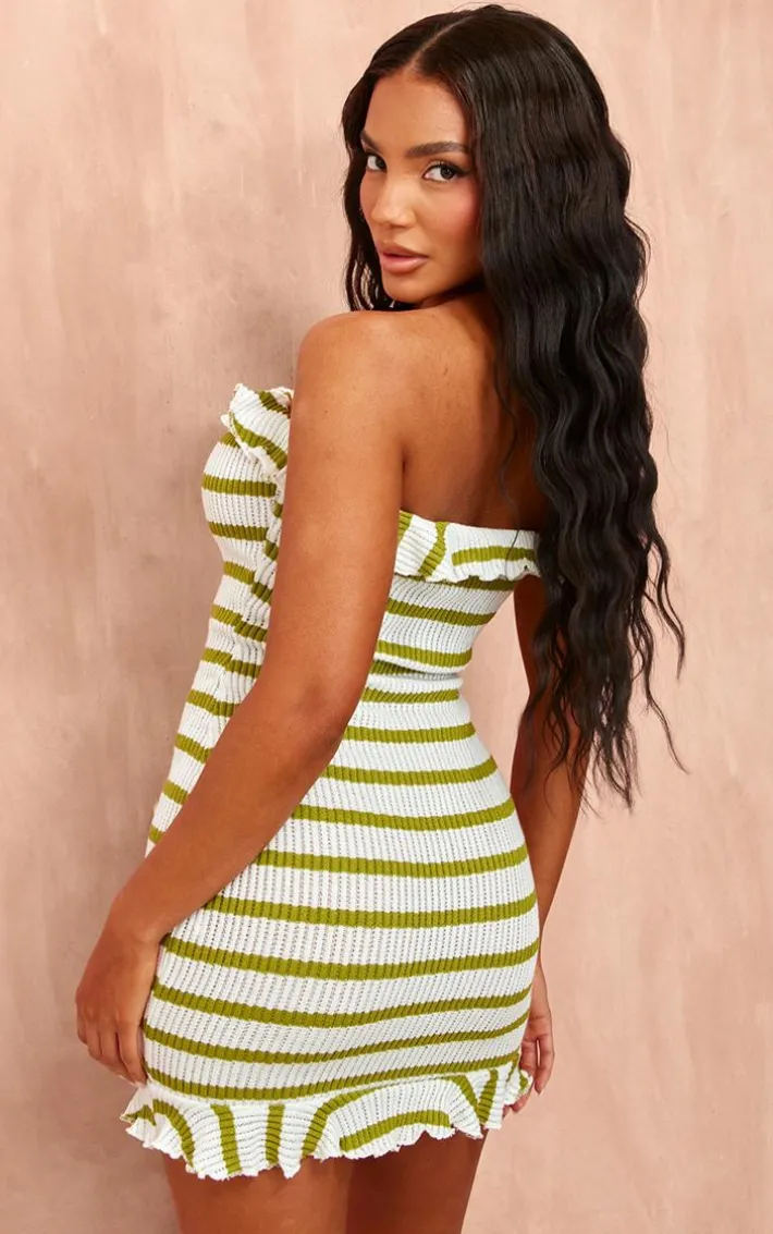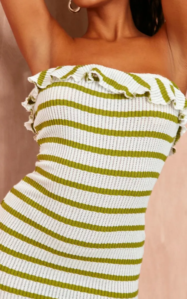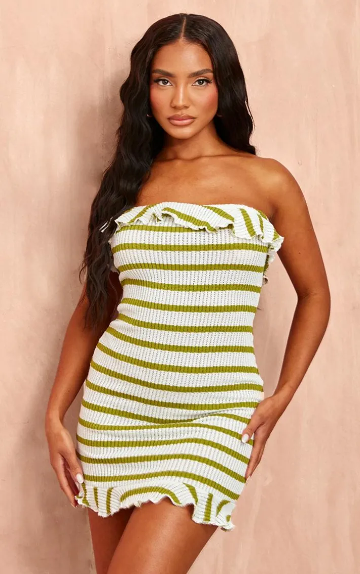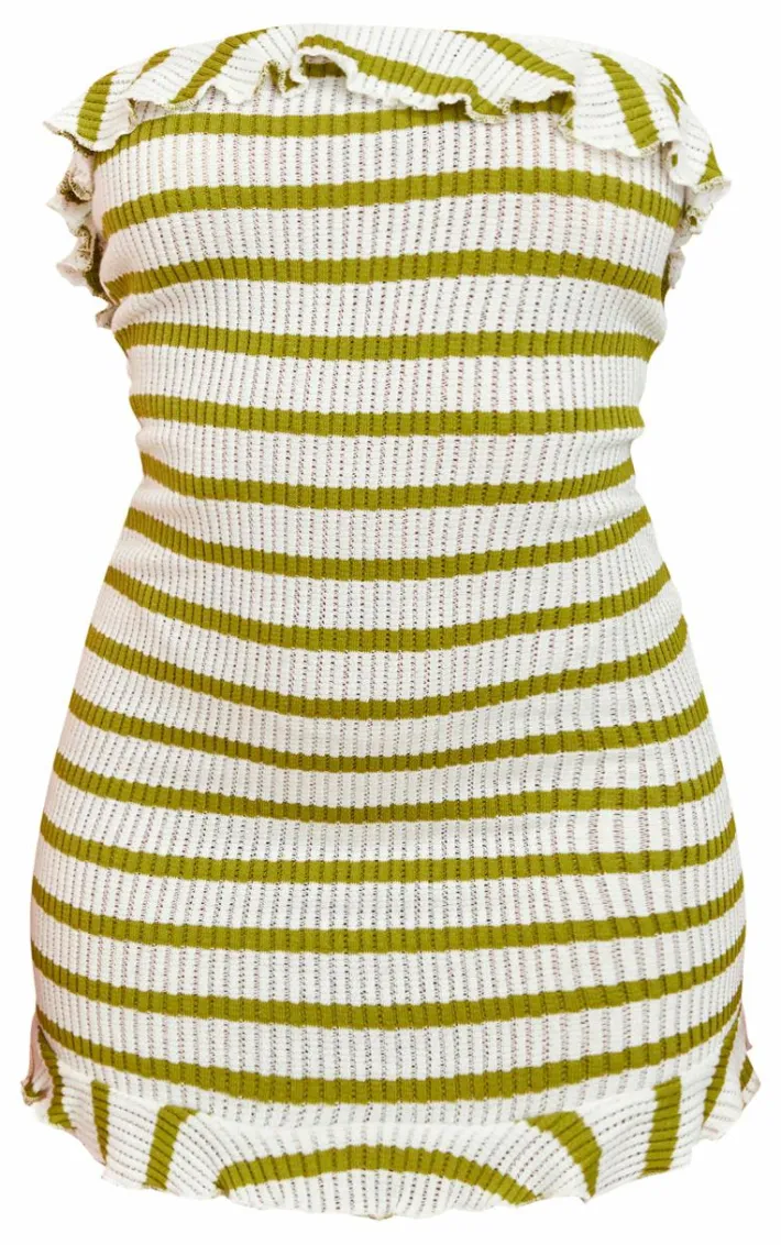 Found some last-minute weekend plans ? Then you need to add this green striped bandeau frill hem textured bodycon dress to your basket. Made from a green textured material with a striped design and a bandeau frill hem detail, how could you say no? Be prepared to turn heads for all the right reasons in this bodycon dress. Simply add your fave heels and gold accessories for a flawless finish.