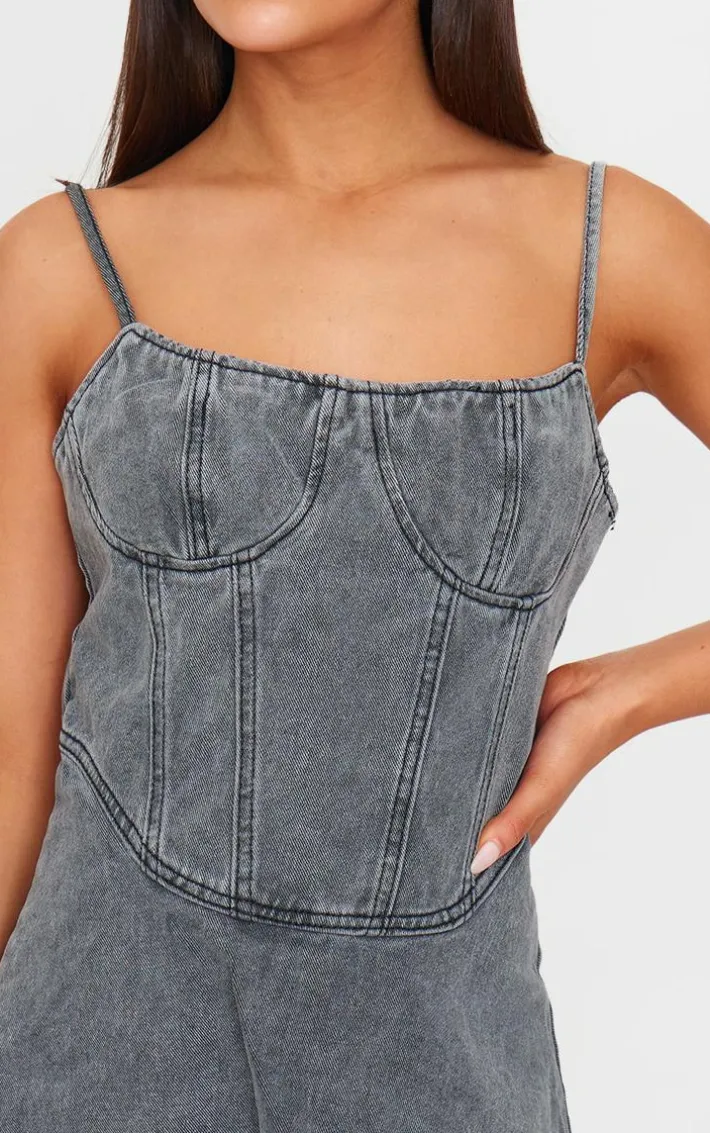 Look all kinds of glam in this grey cami strap bustier denim mini dress. Brought to you in a grey hue denim material with a cami strap detail and bustier design, this mini dress is everything you need and more. Style with loafers and silver accessories for an edgy finish we can’t take our eyes off. It’s a yes from us.