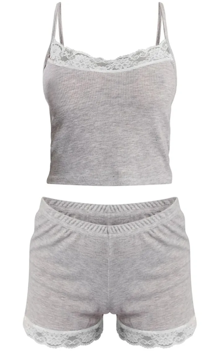 We are obsessing over this grey lace trim rib crop cami and shorts pj set for your new season wardrobe. Brought to you in a grey material with a lace trim, we are obsessed. With a crop cami and a pair of pj shorts, this set is all you need for those nights in. Team the set together with your fave accessories to complete the look we are loving.