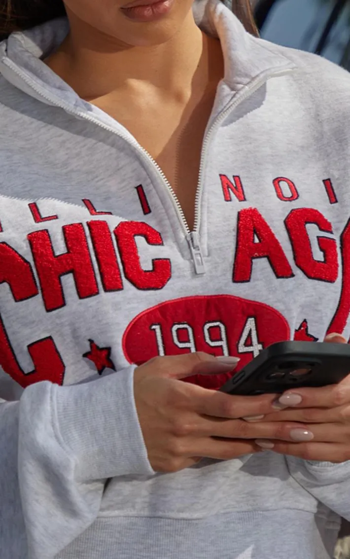Elevate your day to day style with this grey marl borg embroidered Chicago high neck quarter zip sweatshirt. Brought to you in a neutral grey marl shade, with a luxe borg embroidered ‘Chicago’ design and a quarter zip finish, how can you say no? Team with a pair of leggings and minimal accessories for a look you’ll reach for again and again.