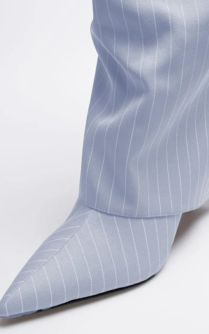 Make a statement in these grey pinstripe point toe fold over knee high stiletto heeled boots. Brought to you in a grey pinstripe material with a point toe design and a fold over knee high style, how can you say no? Style these heeled boots with your weekend outfit to take your look to a whole new level.
