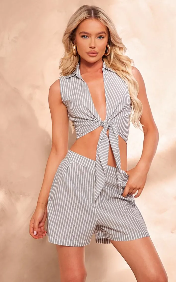 Your new season wardrobe is calling out for these fey stripe linen look tailored shorts. Brought to you in a grey linen look material with a stripe design, what more could you want ? These tailored shorts are sure to solve all of those what to wear dilemmas and beyond. Team with the matching top and a pair of slip on sandals to finish off the look we are loving.