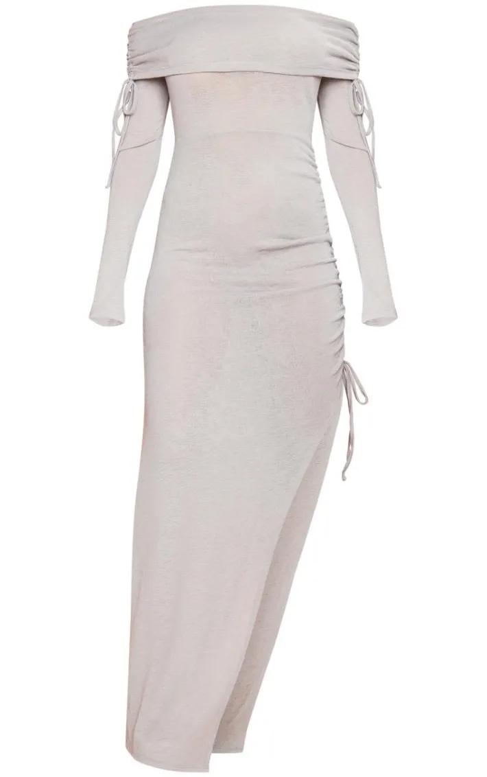 Get ready to look all kinds of chic in this grey textured jersey bardot ruched midaxi dress. Brought to you in a grey hue textured jersey material with a bardot neckline, ruched detailing and long sleeves, we are obsessed. In a figure-worshipping midaxi fit, you are guaranteed to steal all the stares in this grey dress. Just add heels and some luxe accessories to elevate the look.