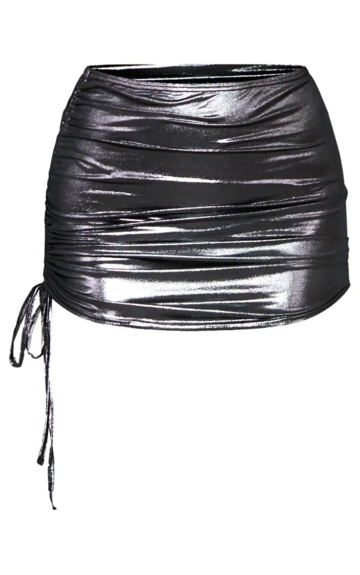 Take your weekend wardrobe to a whole new level with this gunmetal metallic ruched side mini skirt, you’re sure to be earning all the likes. Brought to you in a gunmetal metallic material with a ruched side design and a figure-flattering fit, you’ll be adding this mini skirt straight to your basket. Team this metallic skirt with a statement top, platform sandals and simple accessories for a flawless finish.