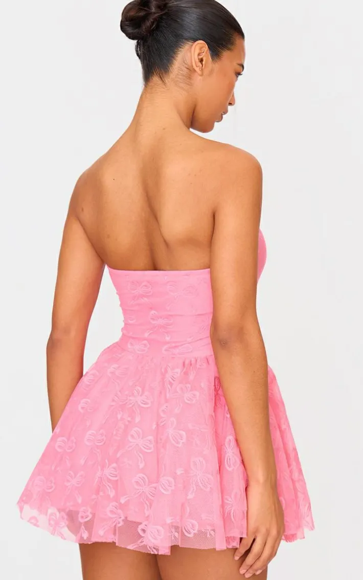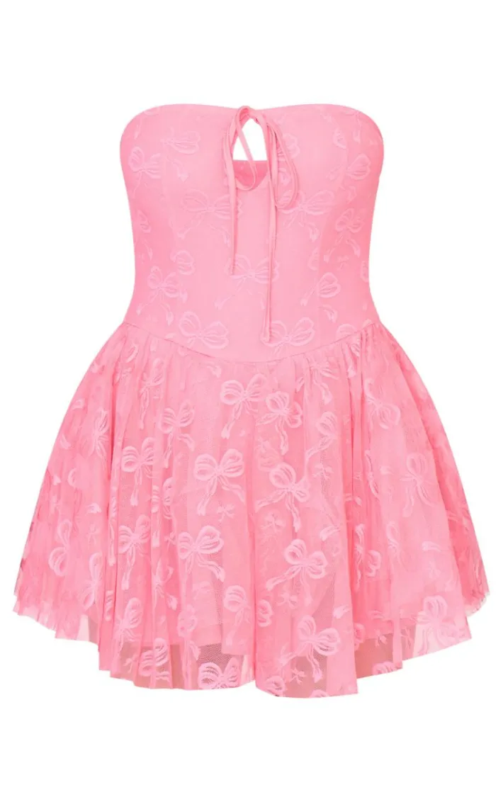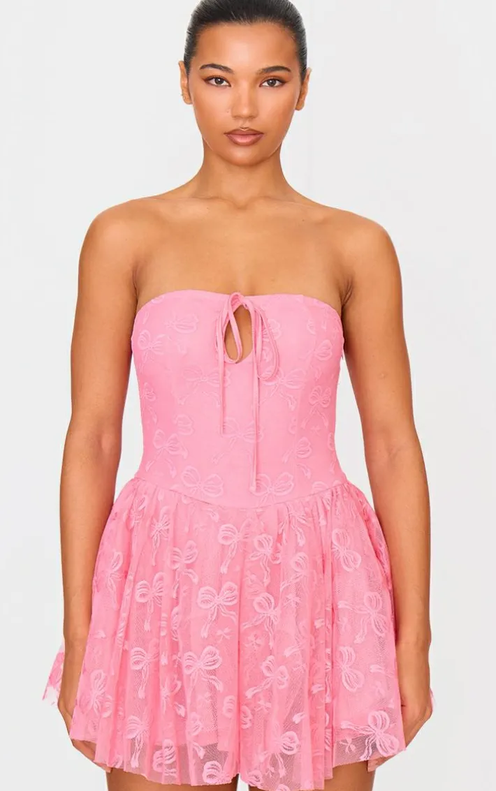 When the weekend calls so does this hot pink bow embroidered lace bandeau romper. Brought to you in a hot pink hue lace material with a bow embroidered design and bandeau neckline, this romper is a yes from us. Style with slip on heels and simple accessories for an elevated finish we can’t take our eyes off.