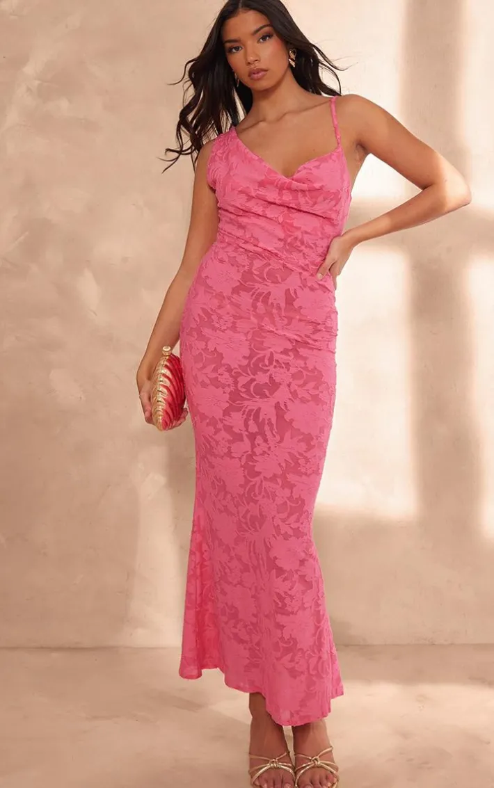 Your weekend outfit is finally sorted with this hot pink devore mesh asymmetric cowl neck maxi dress. Brought to you in a hot pink devore mesh material with an asymmetric cowl neckline and maxi length, how can you resist? Style this maxi dress with heels and gold accessories for a luxe look we’re crushing on.