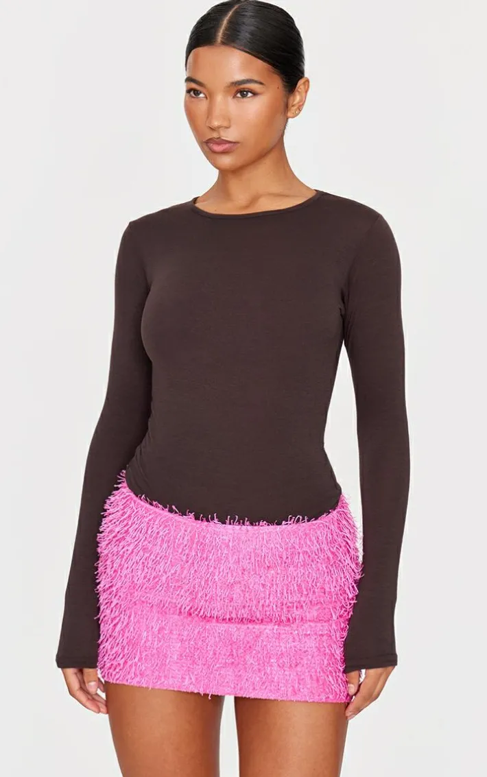 Add a pop of pink to your weekend wardrobe with this hot pink eyelash tinsel detail mini skirt. Brought to you in a hot pink eyelash material with tinsel detailing and a mini fit, how can you resist? Style this mini skirt with a long sleeve top and heels for a look that won’t go unnoticed this weekend.