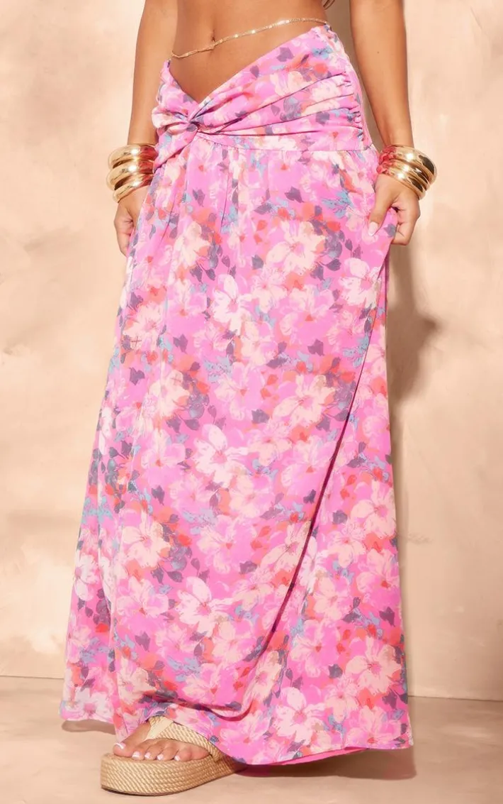 Don’t blend in with this hot pink floral print twist front maxi skirt. Brought to you in a hot pink material with a floral print design and a twist front detail, we are obsessed. This maxi skirt is sure to get hearts racing no matter what. Team with your fave sandals and a bikini top for a look like no other.