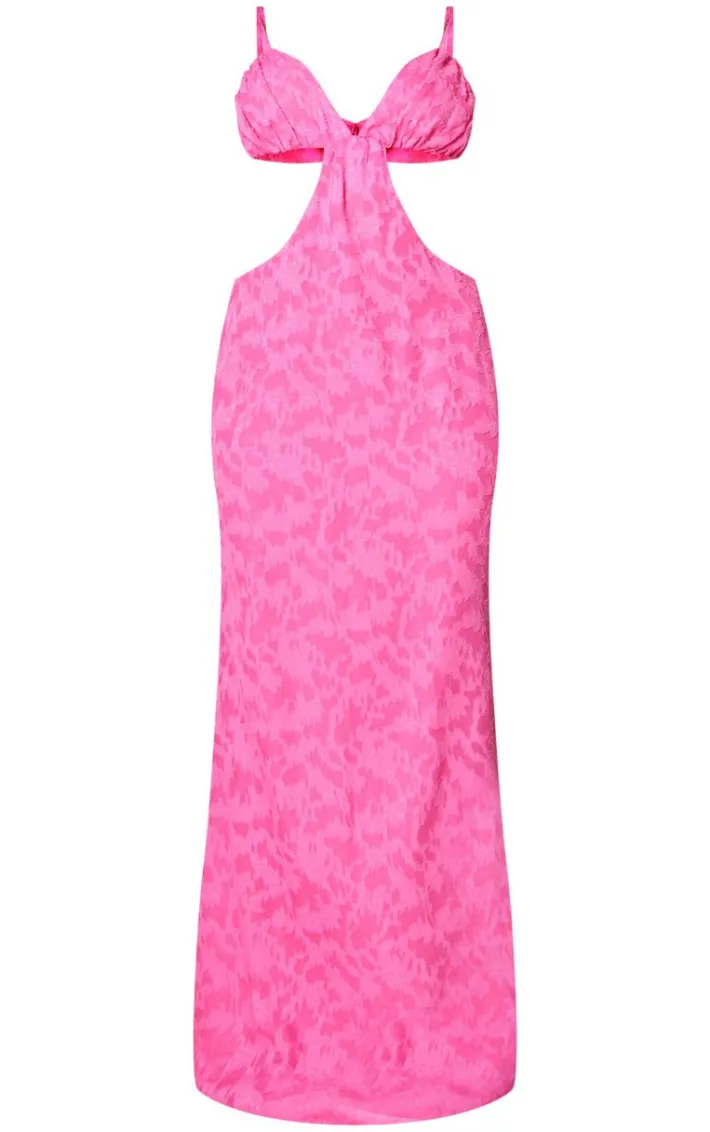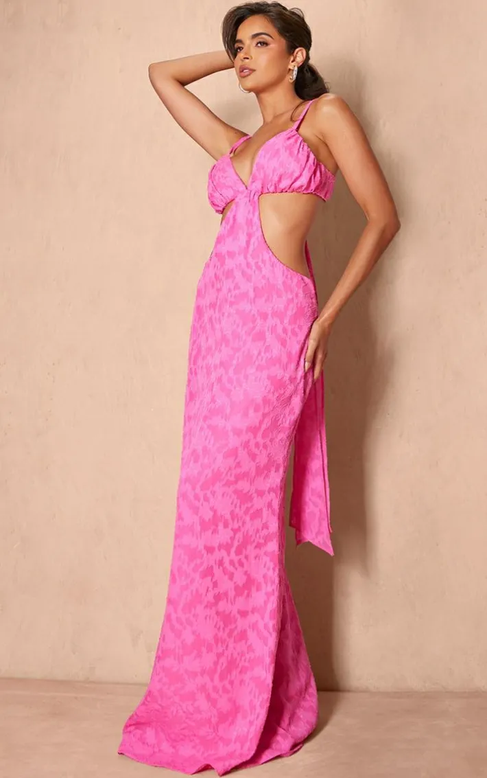 Say hello to this hot pink jacquard cut out maxi dress. Brought to you in a hot pink jacquard material with a cut out design, this maxi dress is the new you need. Style with a pink mini bag and heels for a statement look that will have heads turning.