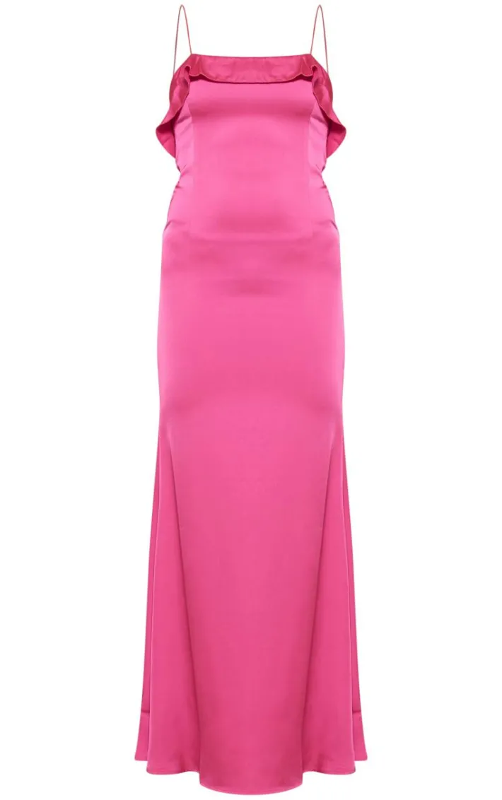 Dare to stand out from the crowd in this statement hot pink satin draped frill back detail maxi dress. With a hot pink satin material, frill back detailing and a maxi length, this dress is perfect for your next upcoming occasion. Style with your highest heels and simple accessories for a look that will bring all the glam vibes.