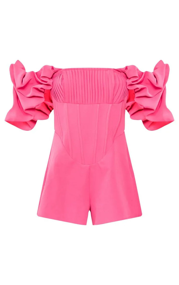 Amp up your weekend wardrobe with this hot pink woven plated corset bardot frill romper. Brought to you in a hot pink woven material with a pleated corset and a bardot frill neckline, what’s not to love? Style this romper with heels and gold accessories to earn all the compliments.