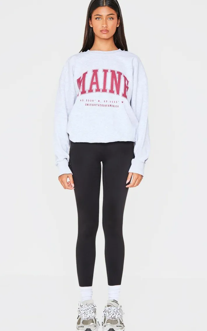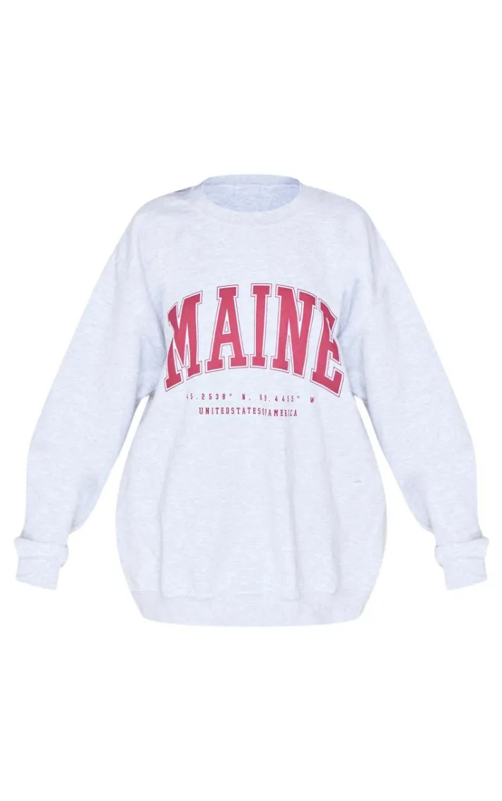 Take your off duty look to new heights with this ice grey Maine print oversized sweatshirt. Brought to you in an ice grey hue sweat material with a Maine print design and oversized fit, this sweatshirt is all the new you need. Style with leggings, fresh kicks and simple accessories for a look like no other.
