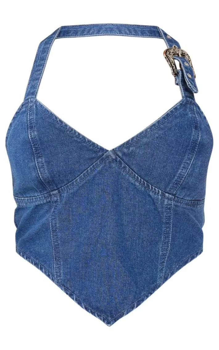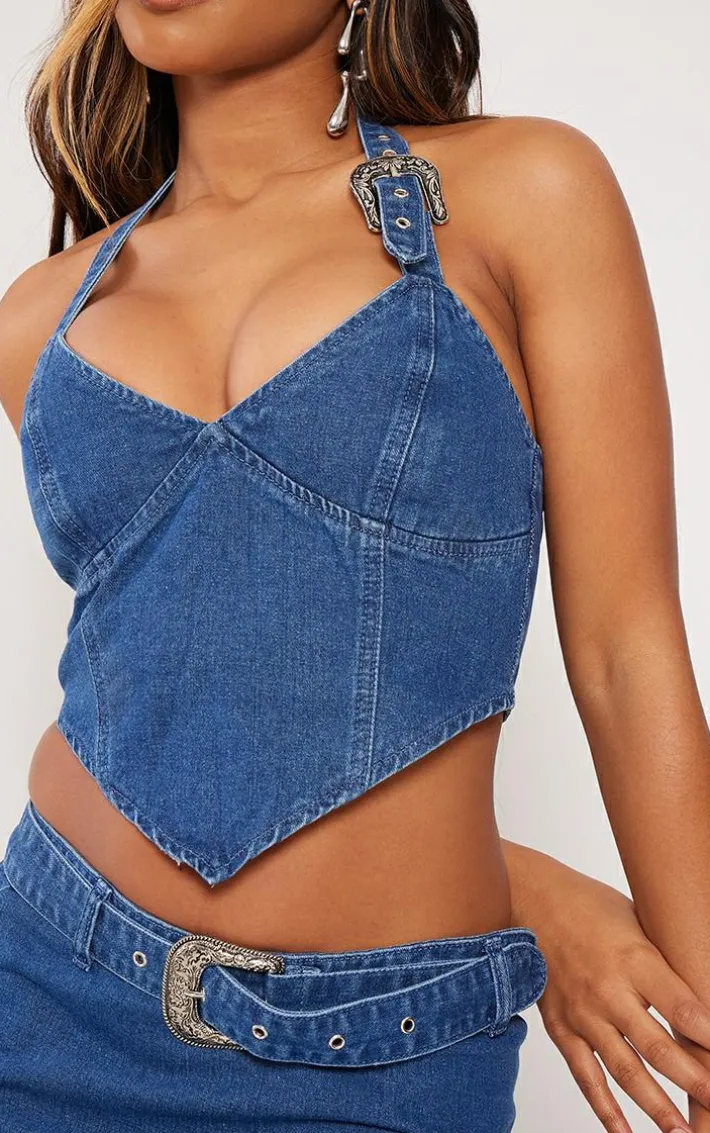 When the weekend calls so does this indigo buckle detail halterneck crop denim top. Made from an indigo denim material with a halter neckline and buckle detail, what’s not to love? Super easy to style, this corset top will be that one piece you keep reaching for. Get that weekend-worthy finish with the matching maxi skirt, bold hue heels and a shoulder bag.