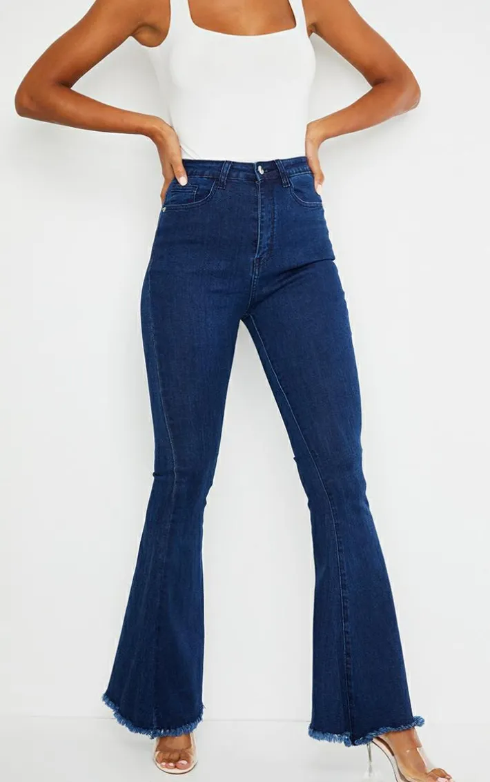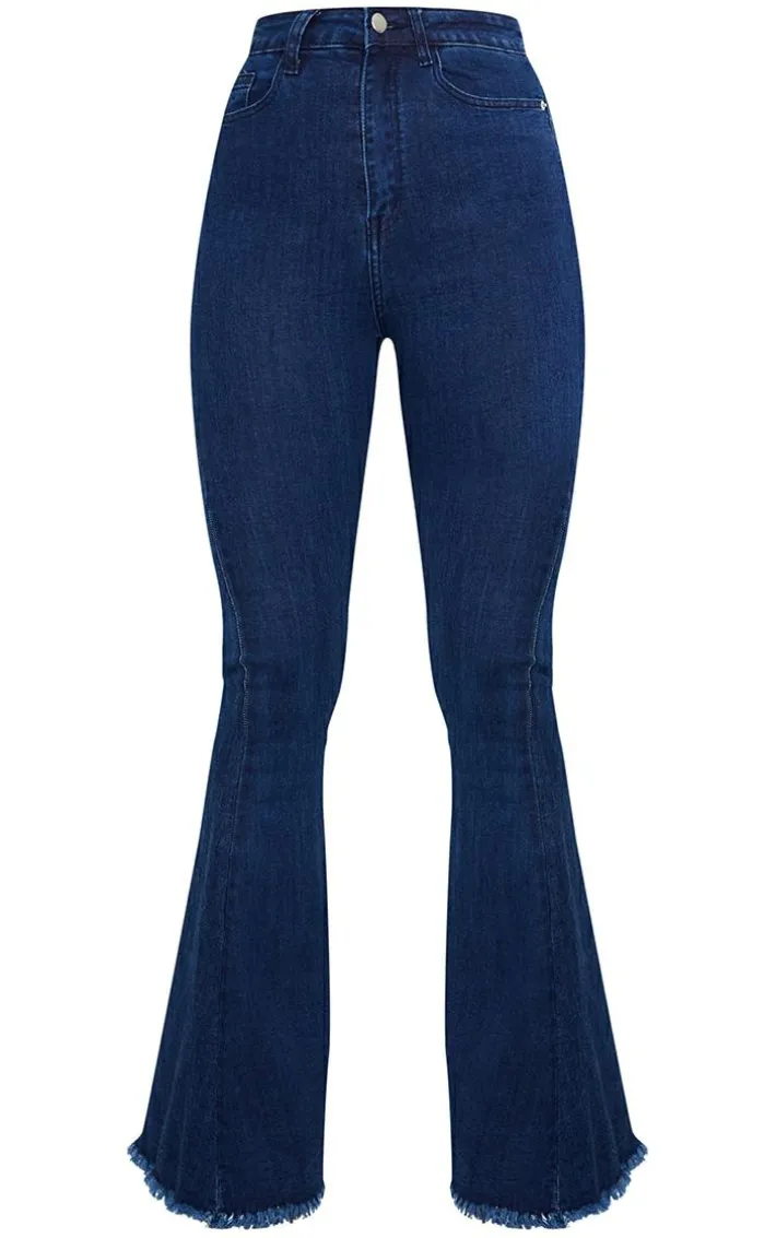 give your denim collection an update with these jeans. Featuring an indigo denim material with raw hem detailing and extreme bell flare design. Team with a simple white body, clear heels, and a shoulder bag for a day.