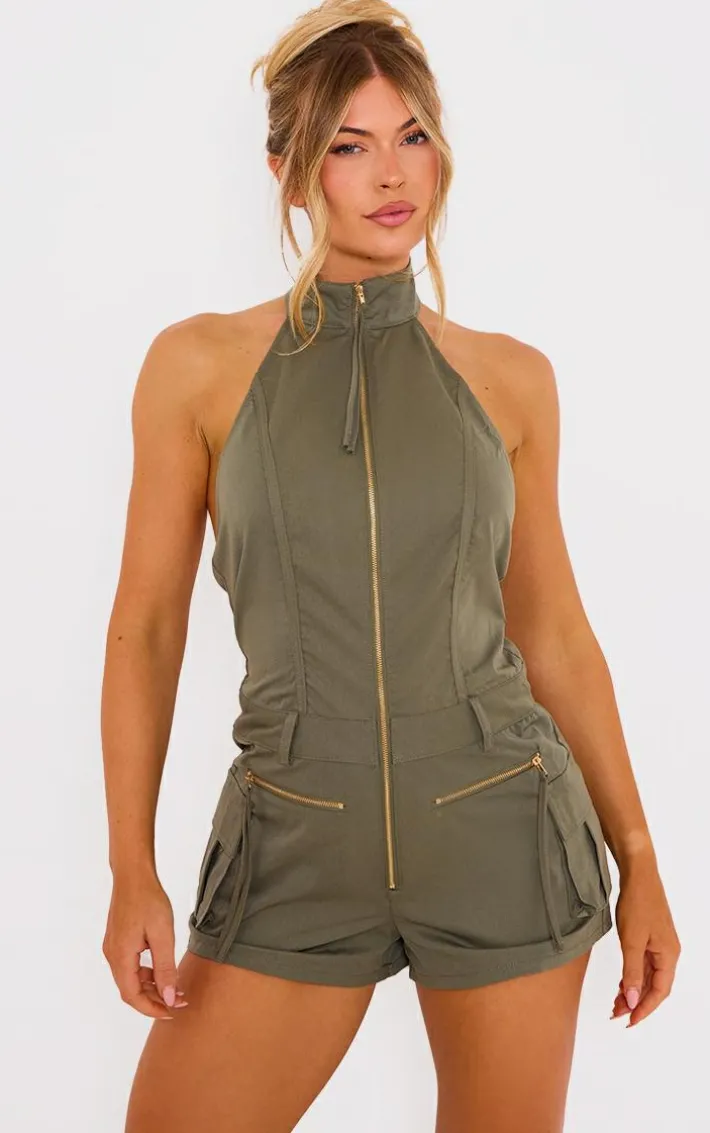 Be on trend this season with this khaki cargo pocket detail halterneck romper. Brought to you in a khaki material with pocket detail and a halter neckline, you will bring all the edge to your outfit of the day. This romper is perfect for those on the go days. Team with high heels and accessories to be the Center of attention wherever you step foot this season.