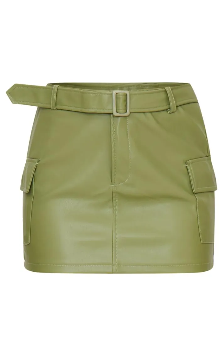 Give your new season wardrobe the chic upgrade it deserves with this khaki faux leather belted mini skirt, it is a must-have for your next night. This skirt features a khaki hue faux leather material with a belt detail and a figure-flattering fit, what more could you want? Team this faux leather mini skirt with a basic top, tan slip-on heels and minimal accessories for a fool proof finish.
