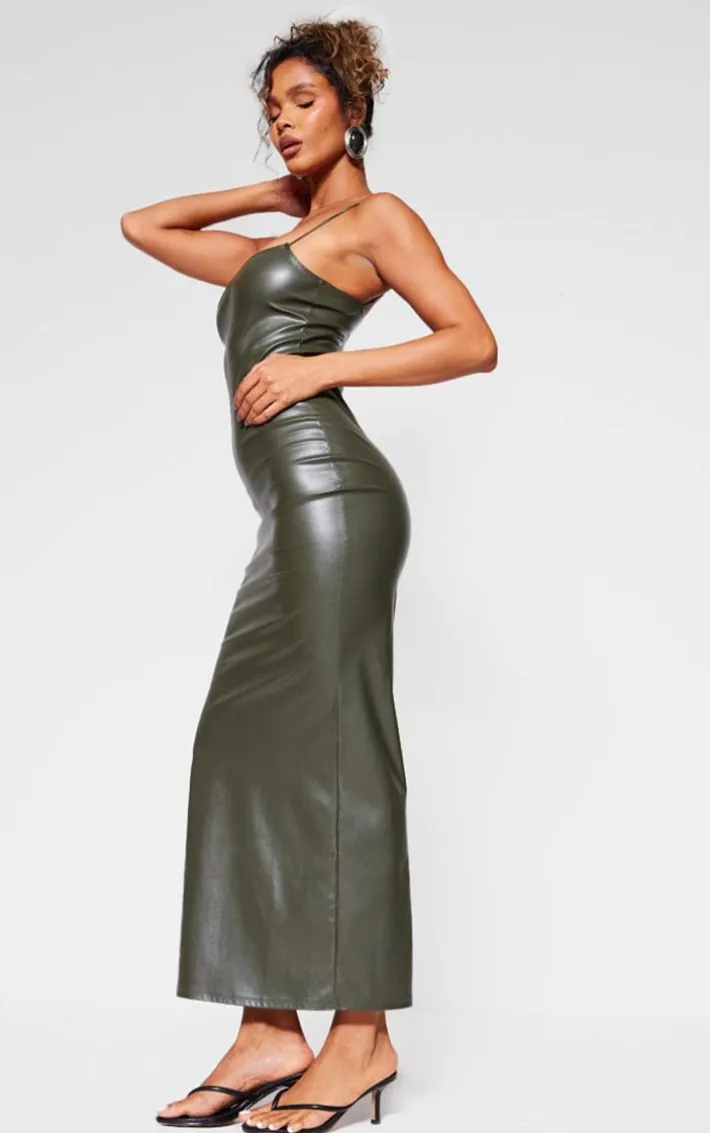 You are guaranteed to steal all the stares with this khaki faux leather spaghetti strap midi dress. Brought to you in a khaki hue faux leather material with spaghetti straps and a figure-worshipping midi fit, how can you not be obsessed? Style this faux leather dress with your highest heels and some gold accessories for a weekend-worthy look that won’t be forgotten.