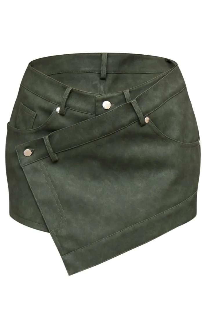 Look all kinds of chic in this khaki faux leather wrap detail skort. Brought to you in a khaki faux leather material with a wrap detail, this skort is at the top of our wish list. Style with a white cropped sweater, knee high boots and your fave shades for an edgy look we can’t get enough of.