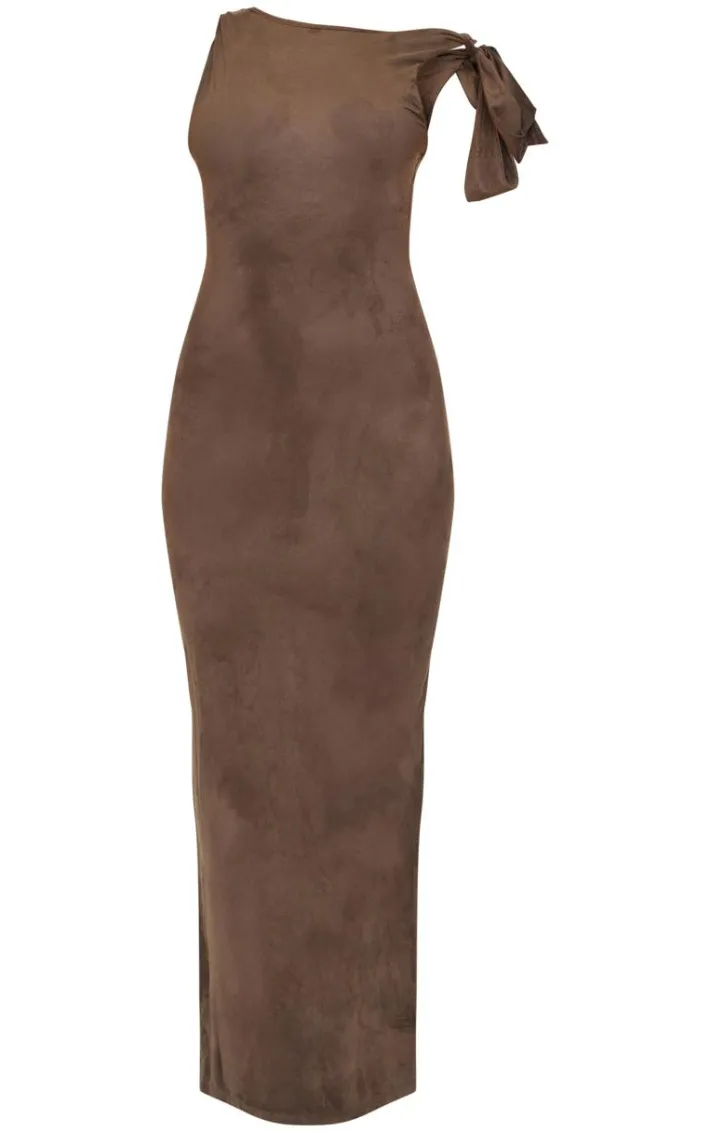 Take the stress out of weekend styling with this khaki faux suede knot drape maxi dress. Brought to you in a khaki hue faux suede material with a knot drape detailing and a flattering maxi fit, how can you resist? Style this maxi dress with heels and gold accessories for a look that is sure to turn heads.