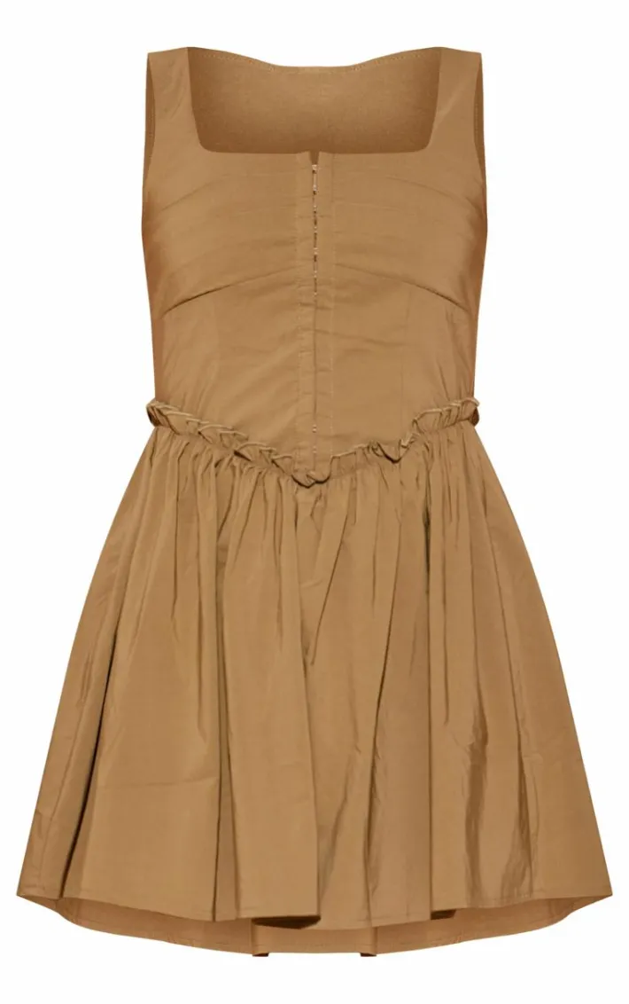 Say hello to your new season staple with this khaki hook and eye ruched shift dress. Brought to you in a khaki material with a hook and eye front and ruched detailing, how could you say no? Style effortlessly with your go-to sandals and accessories for a look that will turn heads for all the right reasons.