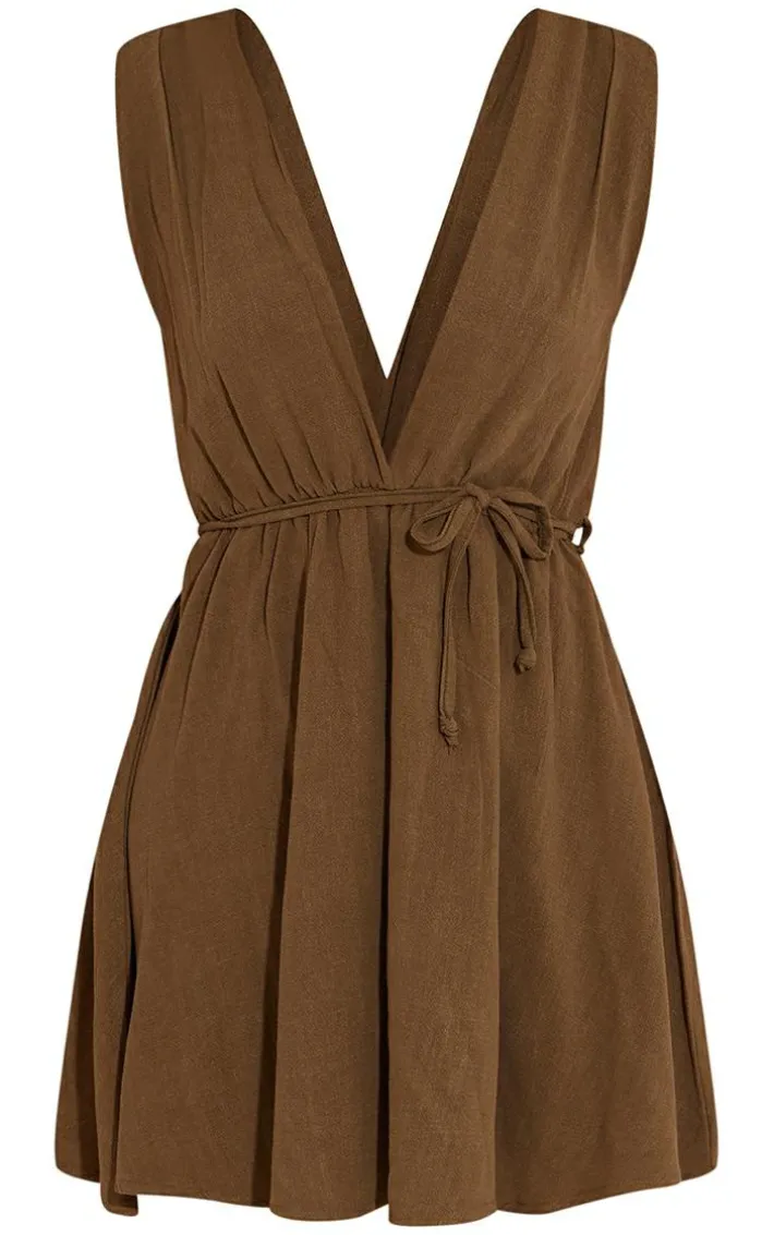 This dress is sure to be at the top of your new season wish list. Featuring a khaki linen look material with a wrap tie design and a shift style. Team with sandals and gold accessories for a fool proof finish.