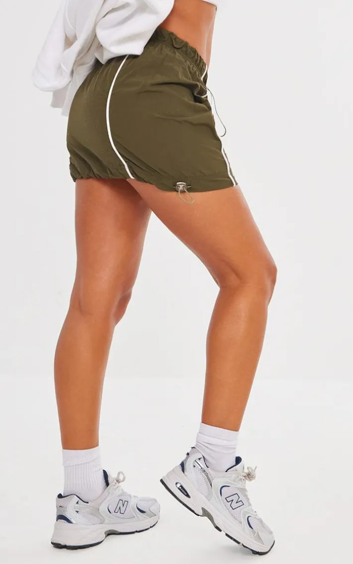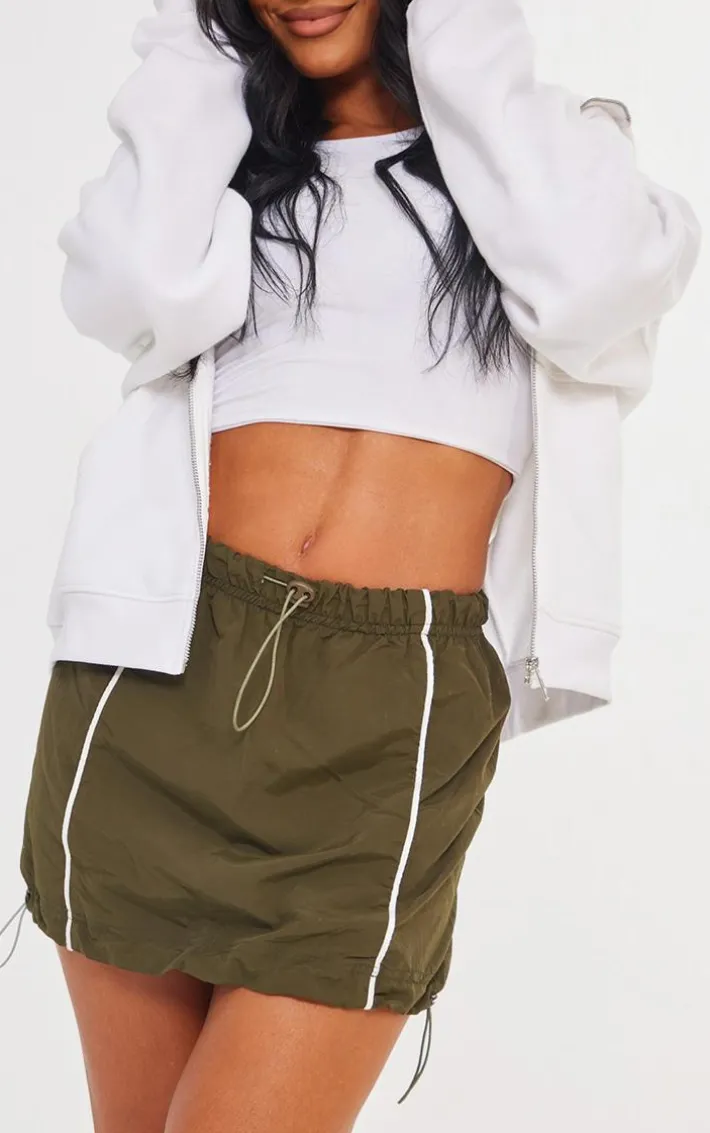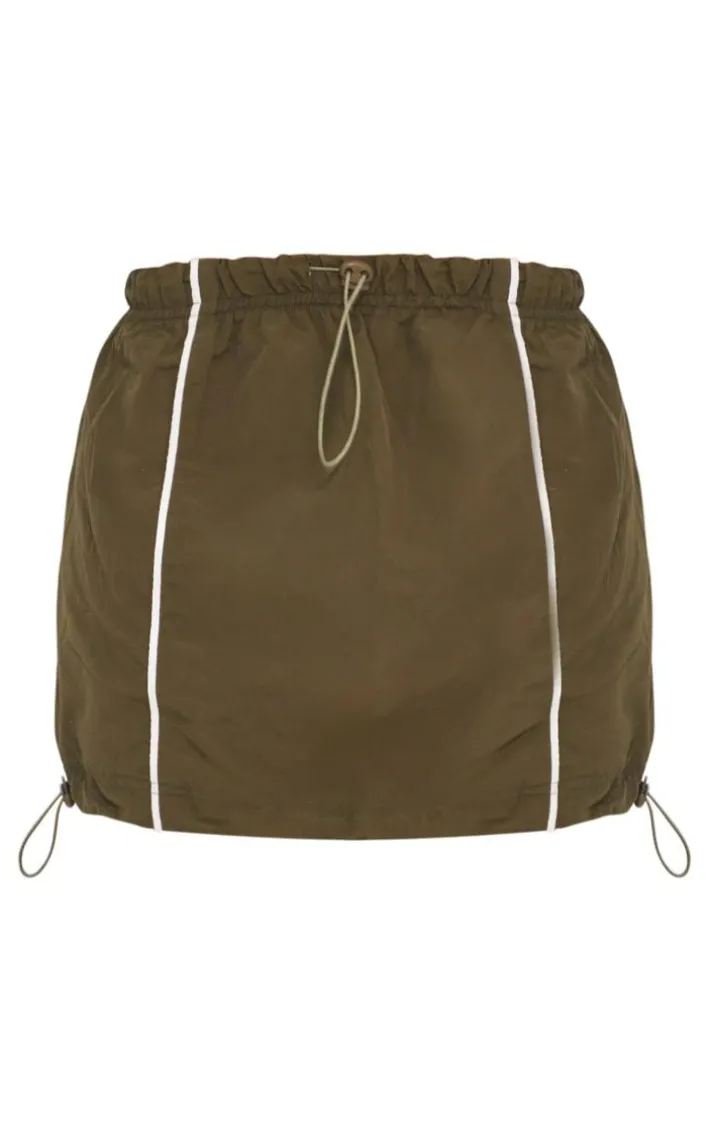 Give your new season wardrobe an upgrade with this khaki parachute shell contrast stitch mini skirt, it is perfect for dressing up or down. With a khaki hue shell material, contrast stitch detailing and a mini length, you’ll be earning all the likes in this mini skirt. Team with a crop top and chunky sneakers for a fool proof look we’re loving.