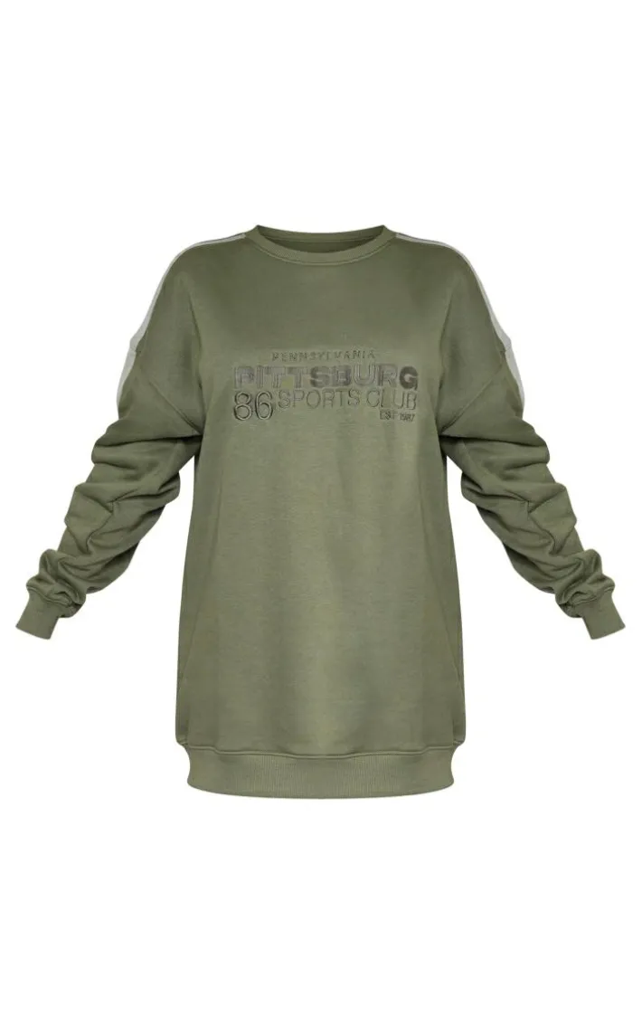 Hit refresh on your new season wardrobe with this khaki Pennsylvania graphic embroidered sweater dress, it is perfect for those off-duty days and beyond. Brought to you in a khaki hue material with an embroidered ‘Pennslyvania’ graphic and a relaxed fit, this dress just went straight to the top of your hit list. Team with some knee high chunky boots, a shoulder bag and a cap for an instant chic finish.