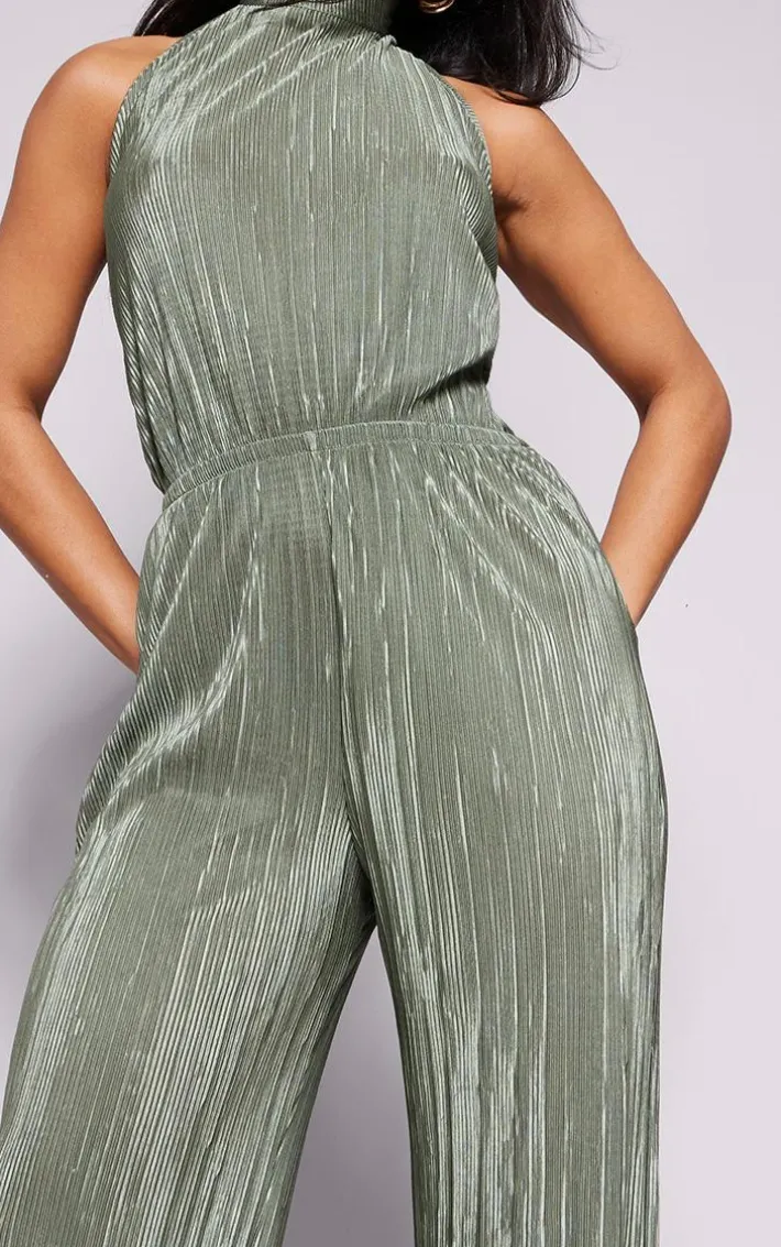 Be on trend this season with this khaki plisse high neck scoop back wide leg jumpsuit. This jumpsuit is brought to you in a khaki plisse material with a high neck, a scoop back and wide leg fit, what’s not to love? This jumpsuit is perfect for your next date night. Simply style with your dreamy high heels and accessories for a look that we can’t stop crushing on.