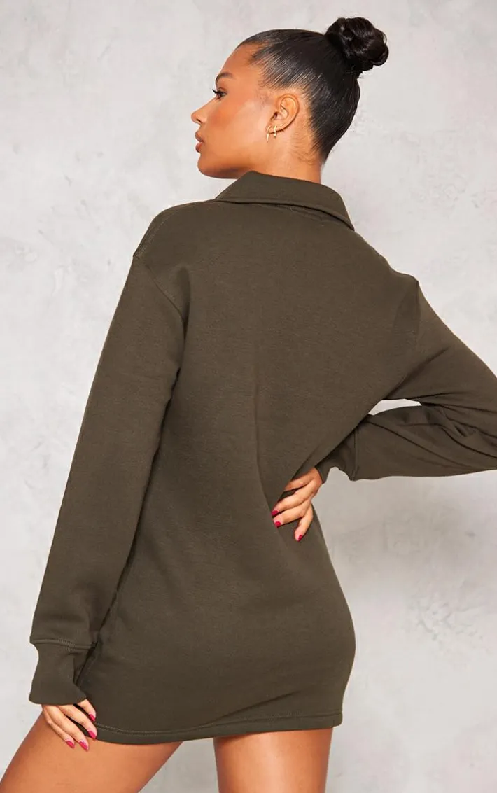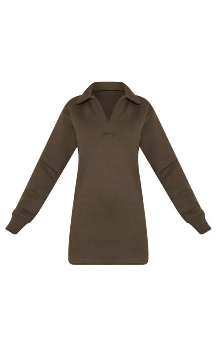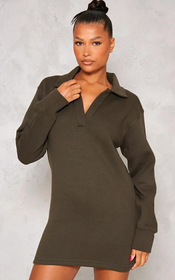 Hit refresh on your new season wardrobe with this khaki shoulder pad open collar boxy sweatshirt dress. Whatever your plans you’ll be obsessing over this sweater dress. It includes a khaki hue sweat material with shoulder pads and an open collar design, how could you say no? Team this khaki dress with chunky sneakers and your fave accessories for a fool proof finish.
