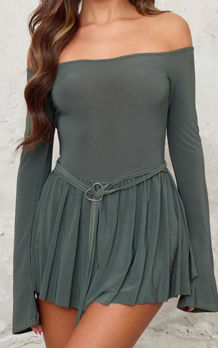 Take on your weekend the right way with this khaki slinky bardot long sleeve heart trim romper. Made from a khaki slinky material with a bardot design and a long sleeve fit, this is everything we’re loving and more. With its heart trim detail, this romper is sure to hug you in all the right places. To complete the look, style this seamlessly with some leather look boots and a shoulder bag for a look that will secure you all the likes.
