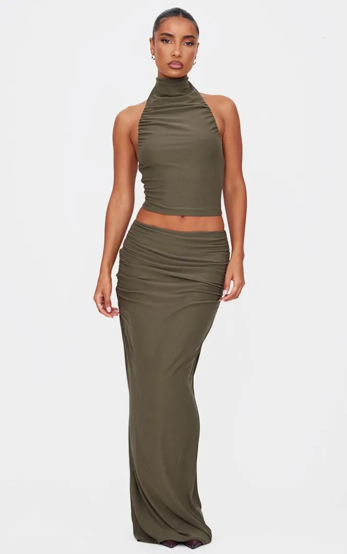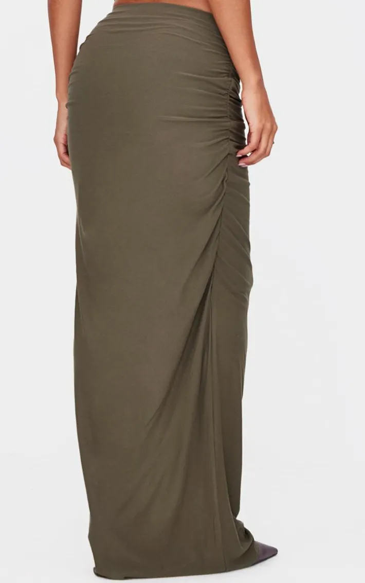 Introducing the khaki soft touch ruched maxi skirt, the new you starts here. Brought to you in a seasonal khaki shade, with a cosy soft touch material and flattering ruched design, this maxi skirt was made to be seen. Pair with the matching top and some heels for a chic finish we’re loving.