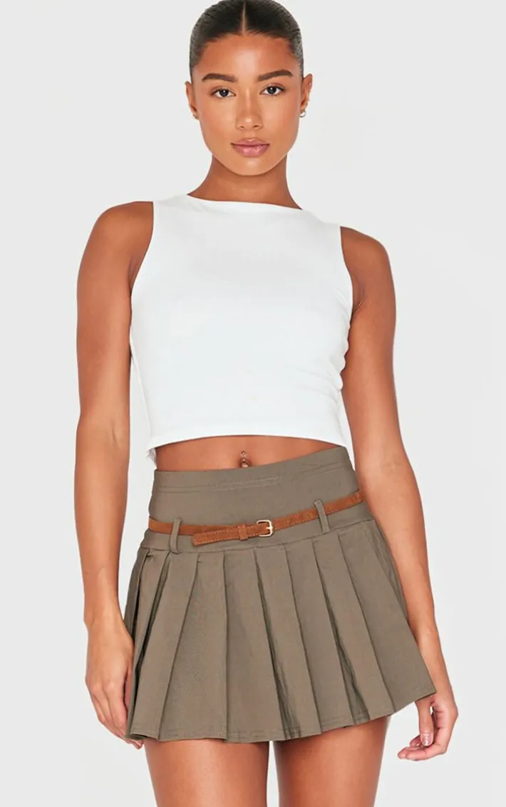 Switch up your new season style game with this khaki stretch woven belt detail pleated mini skirt. We just can’t get enough of its khaki stretch woven material with a pleated design and brown belt detail. Just add a long sleeve top, a blazer and chunky knee high boots to this mini skirt for a look that will earn you all the compliments.