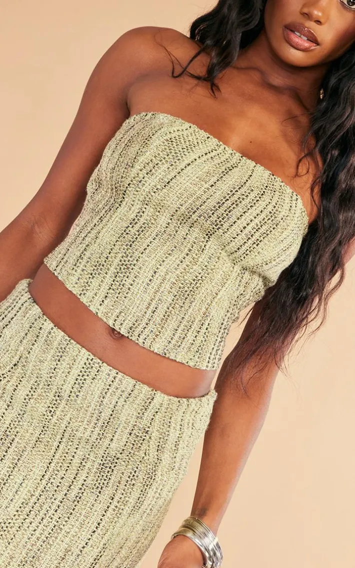 Get ready to turn heads for all the right reasons with this khaki textured boucle tweed bandeau corset. Brought to you in a khaki textured boucle material with a tweed design and a bandeau style, this corset is calling your name. If it’s a date nightor a night with your significant other this corset has you covered. Pair with the matching mini skirt, high heels and gold accessories for a look like no other.
