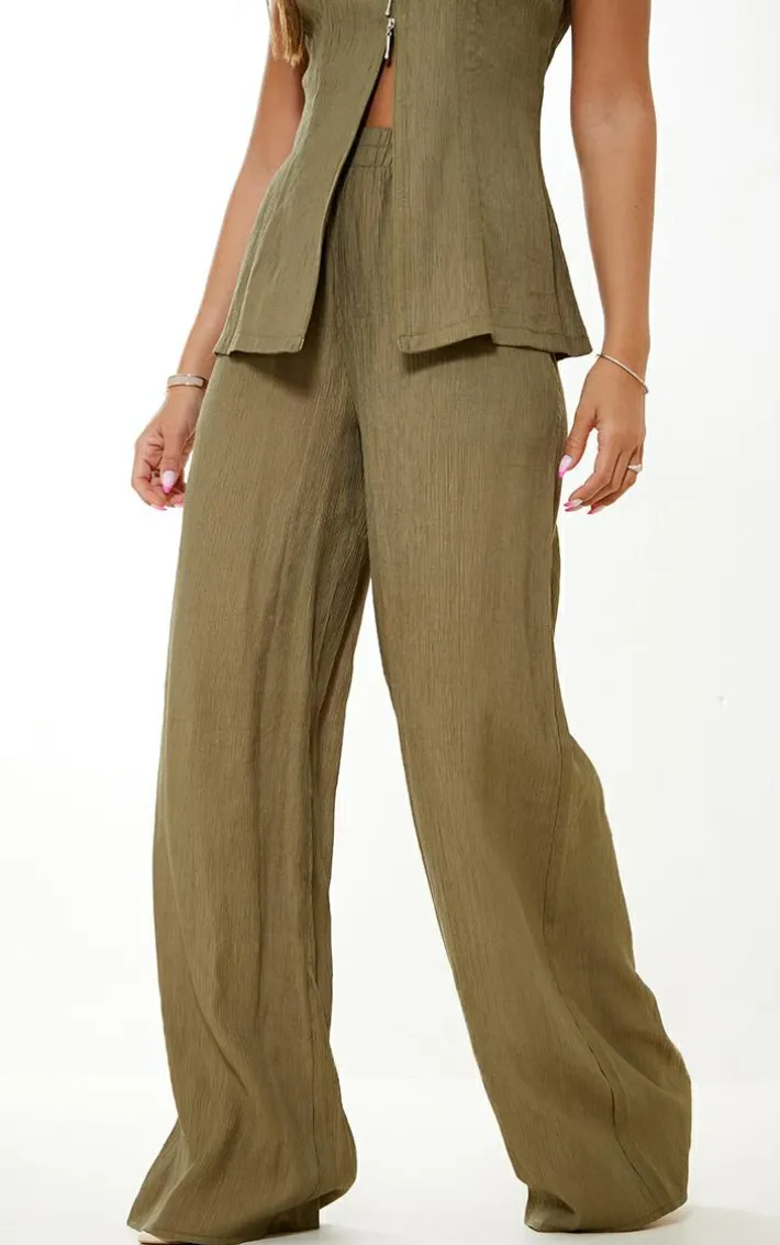Your weekend wardrobe wouldn’t be complete without these dreamy khaki textured sheer woven wide leg pants, get ready to steal all the stares doll. These bottoms feature a khaki textured sheer woven material with a wide leg design and a relaxed fit, how could you say no? Style with the matching top, a mini bag and your highest slip-on heels for the ultimate dreamy date night look.