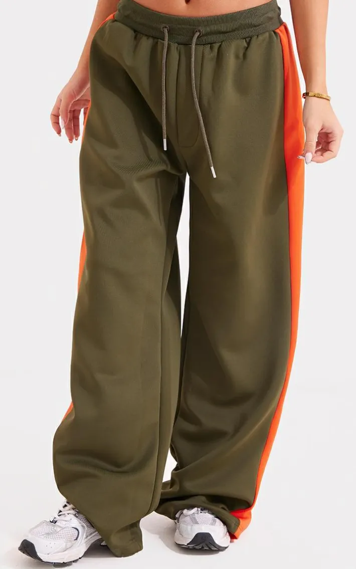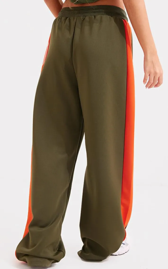 Take your off-duty look tonew heights with these khaki tricot side stripe wide leg track Pants. Brought to you in a khaki hue material with a tricot side stripe design and a wide leg fit, how can you go wrong? Team these track Pants with a crop top, sneakers and your everyday accessories for a look that is sure to earn you soe serious style points.