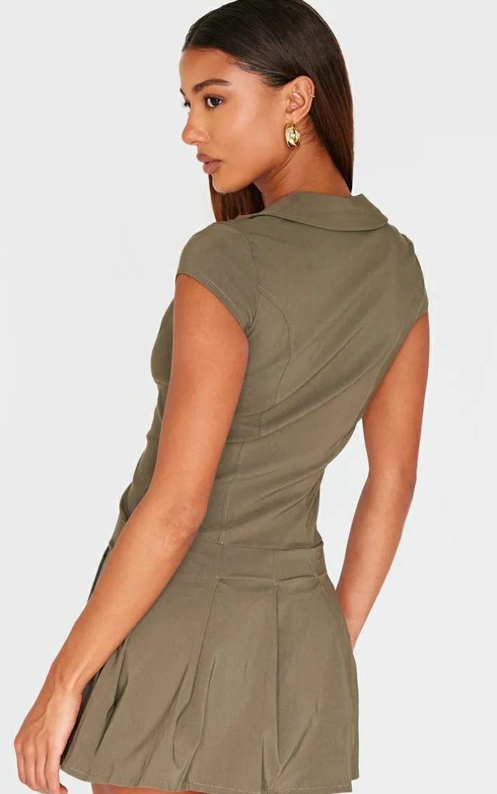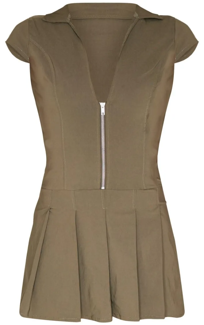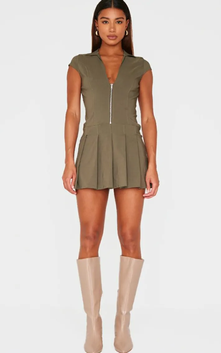 Stay in style this season doll with this khaki zip up pleated shift dress. Brought to you in a khaki hue material with a zip up fastening and pleated design, this shift dress is at the top of our wish list. We’re in love. Style with knee high stiletto boots and chic accessories for a combo we’re crushing on.