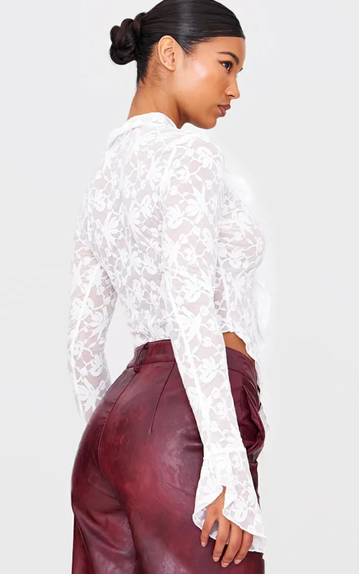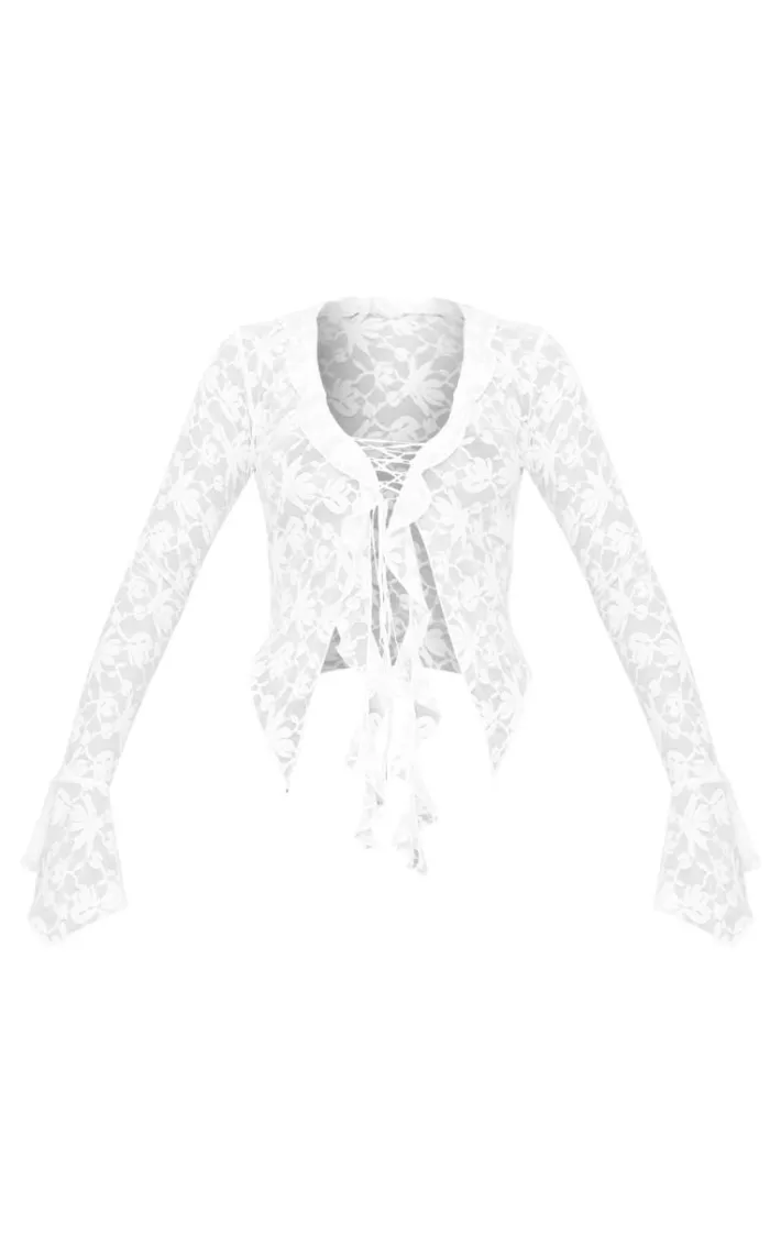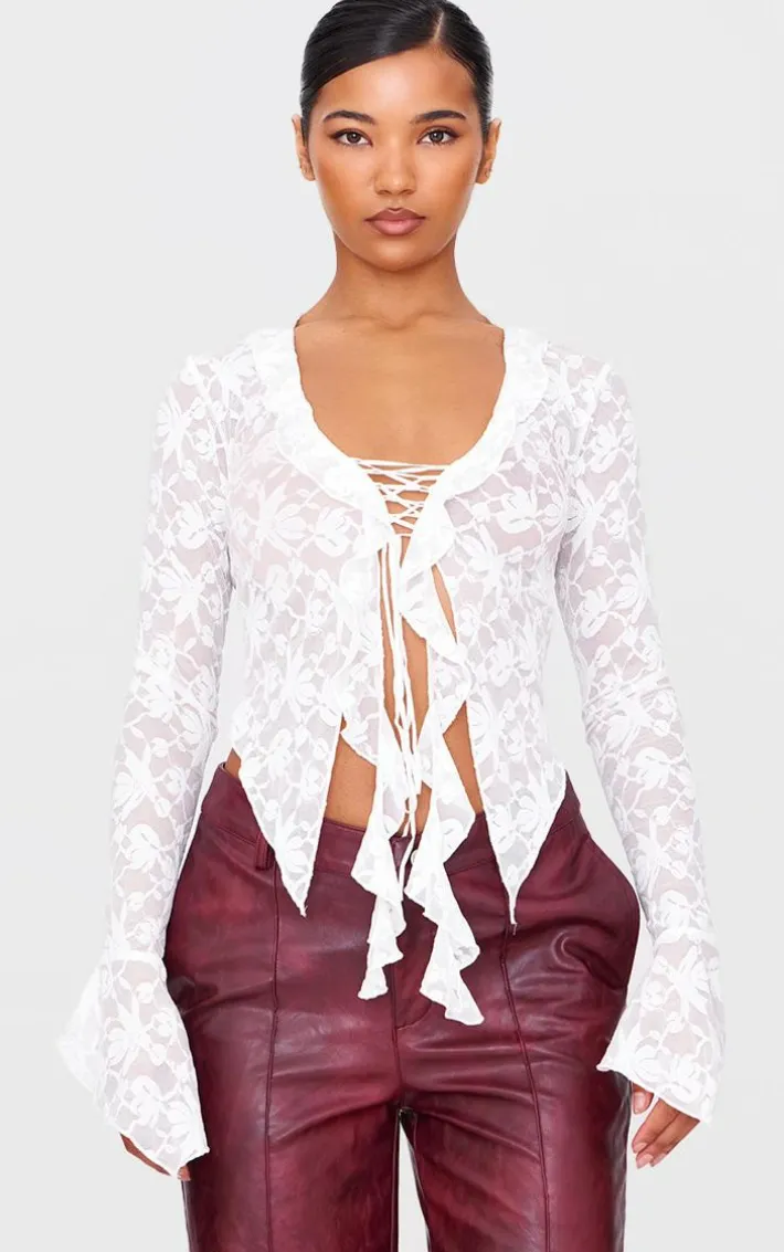 Instantly elevate your outfit of the day with this white lace tie front ruffle blouse. Brought to you in a white hue lace material with a tie front design and ruffle detailing, how can you resist? Style this white blouse with faux leather bottoms and heels for an effortlessly chic look worthy of your weekend plans.