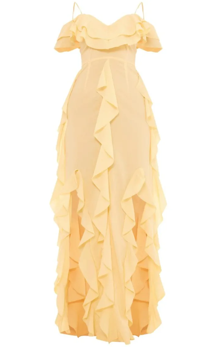 Channel the look everyone is talking about in this lemon cold shoulder ruffle detail maxi dress. Brought to you in a dreamy lemon hue material with a cold shoulder design and ruffle detailing for that extra touch of glam, we are so obsessed. Style this maxi dress with your highest heels and some glam accessories for an occasion look that is guaranteed to steal all the stares.
