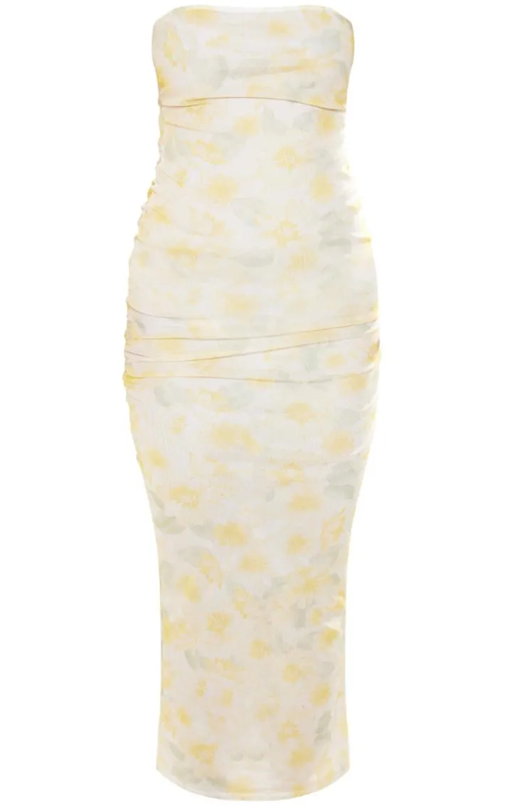 Make heads turn for all the right reasons in this lemon floral print mesh bandeau midaxi dress. Brought to you in a lemon hue mesh material with a dreamy floral print design, a bandeau neckline and a flattering midaxi fit, how can you not be obsessed? Style this lemon dress with heels and some glam accessories to take your look to a whole new level.