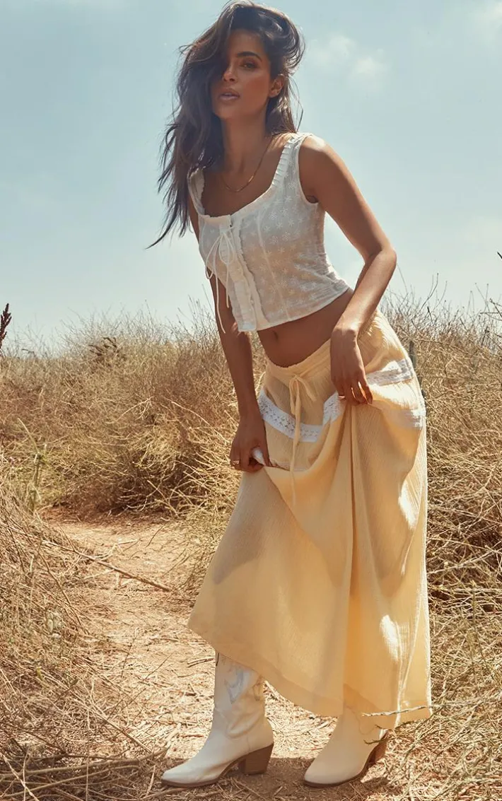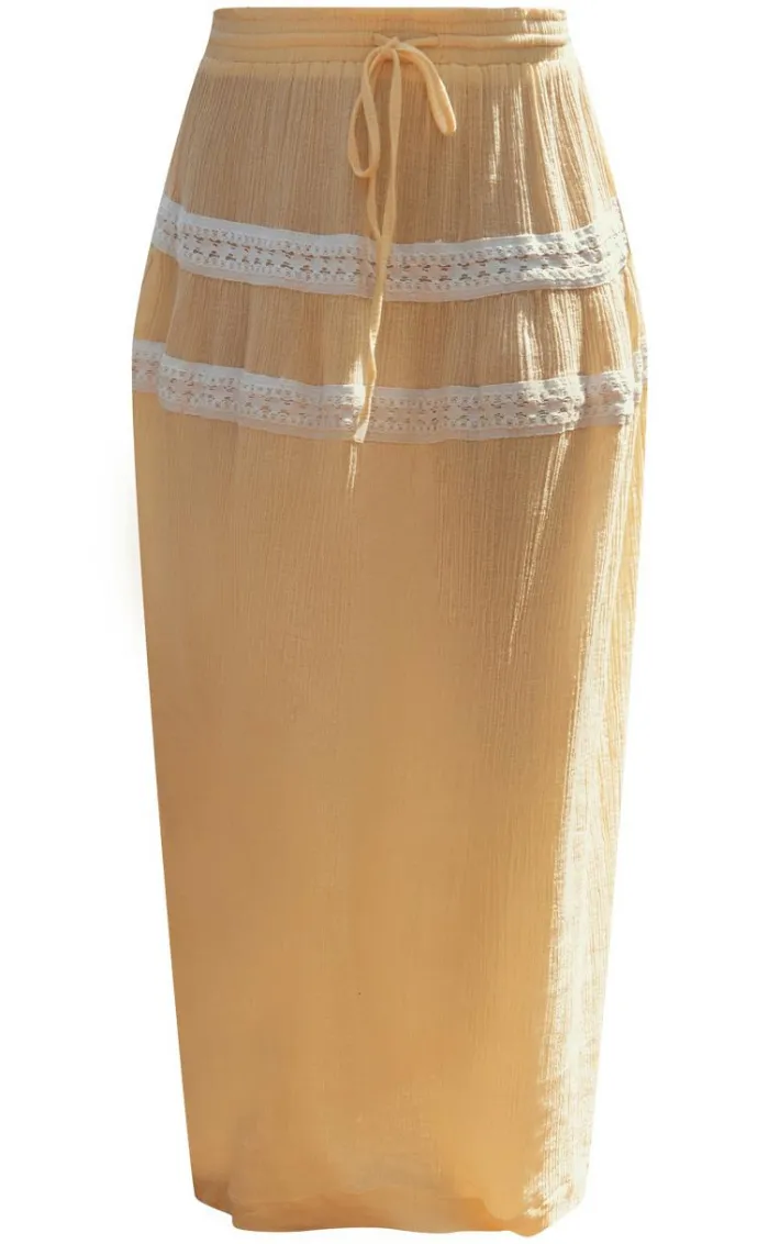 Take on your weekend the right way with this statement lemon lace trim cheesecloth drawstring waist maxi skirt. Made from a lemon cheesecloth material with a drawstring waist and a lace trim detail, this is everything we’re loving and more. With It’s figure-hugging fit this maxi skirt is sure to hug you in all the right places. To complete the look style this seamlessly with a crop top, high heels and accessories for a look that will secure you all the likes.