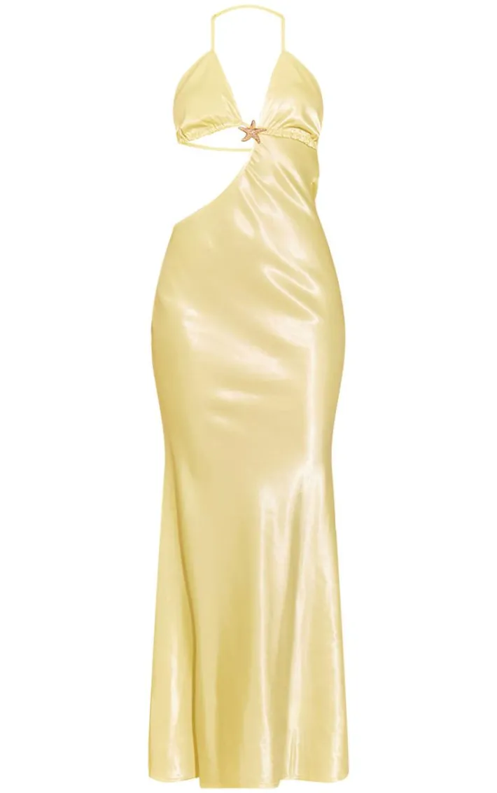 Stay in style this season with this lemon satin cut out halter neck maxi dress. Brought to you in a lemon satin material with a cut out detail and halter neck design, this maxi dress is everything you need and more. Style with white heels and gold accessories for a statement finish. It’s a yes from us.