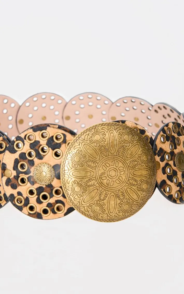 Instantly elevate your outfit of the day with this leopard faux suede studded buckle shield belt. Brought to you in a leopard print faux suede material with a buckle fastening and studded detailing, how can you resist? Style this faux suede belt with any look for a statement finishing touch.