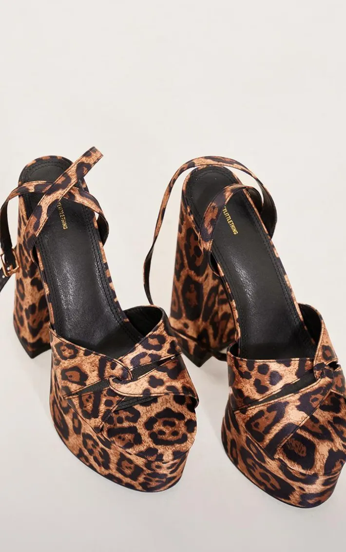 Inject some fierce animal prints into your shoe collection with these leopard print satin chunky platform intertwined strap block heeled sandals. Made from a leopard print satin material with an intertwined strap and a chunky block platform heel, we are obsessed. Just add these heeled sandals to a matchig print ‘fit for a look that will really make a statement.
