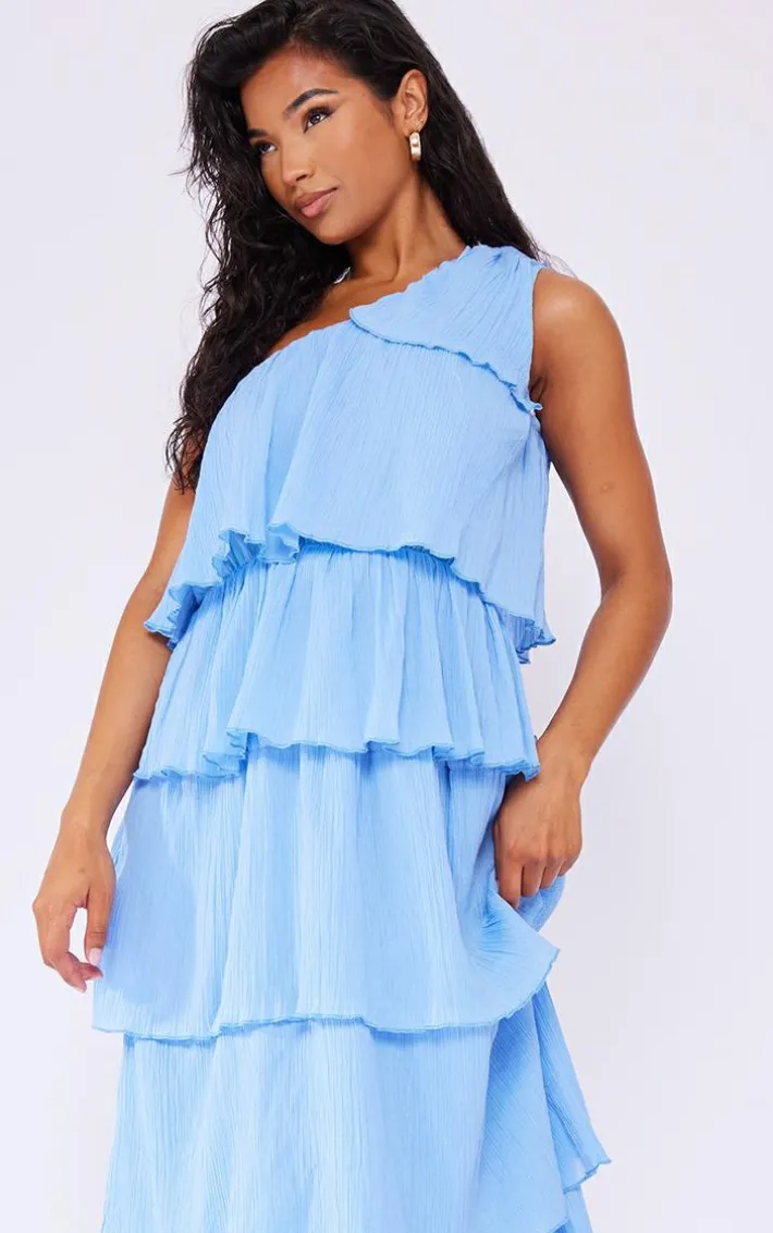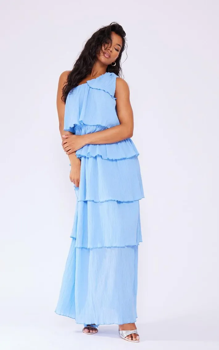 Hit refresh on your summer wardrobe this season with this light blue crinkle one shoulder tiered maxi dress. Its light blue crinkle material brings all the glam vibes to your look whilst its one-shoulder design and tiered details gives you that seriously chic touch. This maxi dress can be dressed up for your weekend plans or dressed down for an everyday look. For that flawless finish, add metallic heels and gold accessories.
