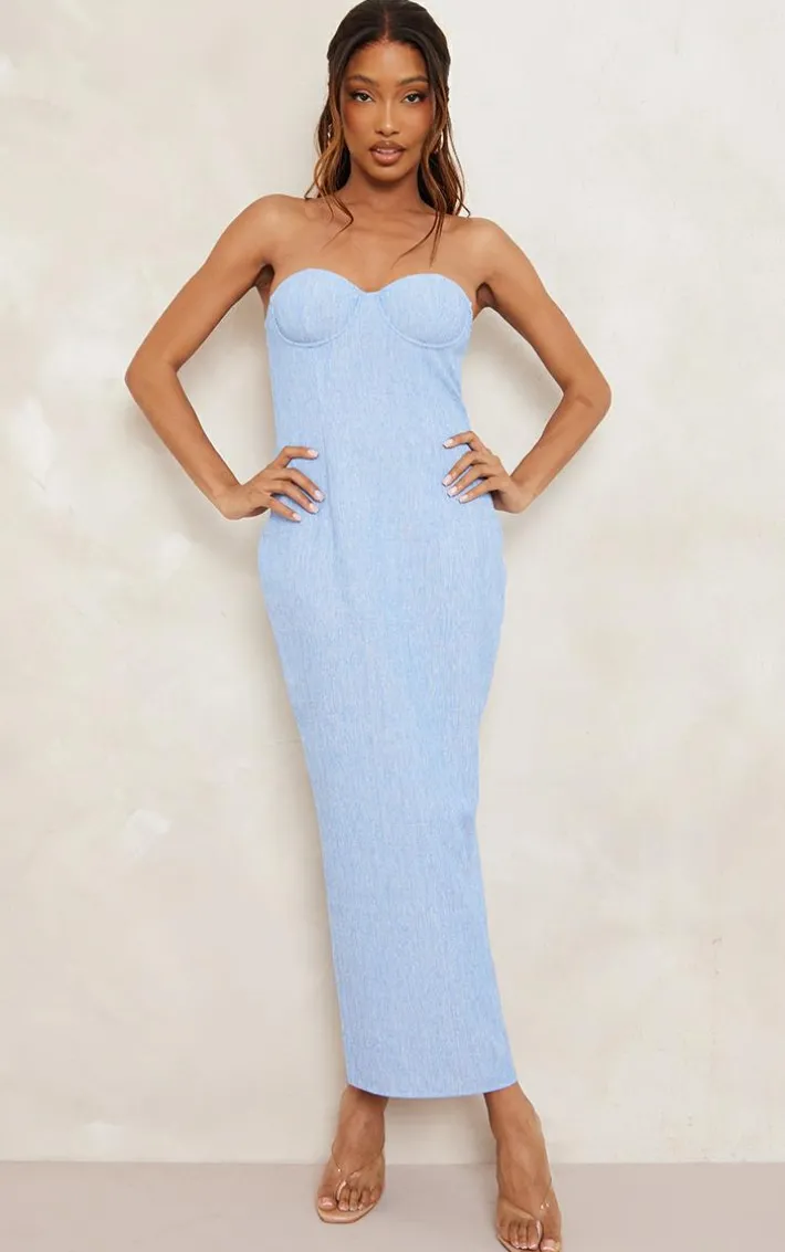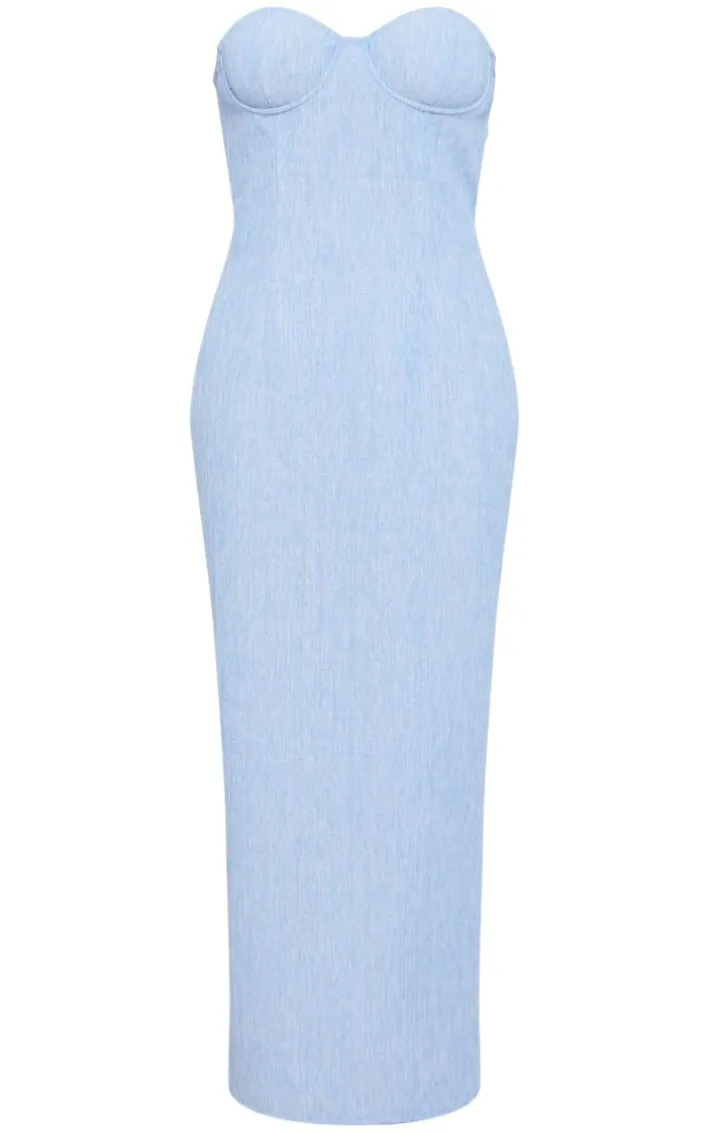 Got a special occasion in the diary ? Then this light blue linen look bandeau underwired midaxi dress is sure to tick all your dress code boxes. With a light blue linen look material, underwired detail, and a bandeau neckline, what’s not to love? This midaxi dress is sure to gain all the compliments with its figure-hugging fit and split hem. Pair with clear heels and gold hoop earrings for a look that won’t go unnoticed.