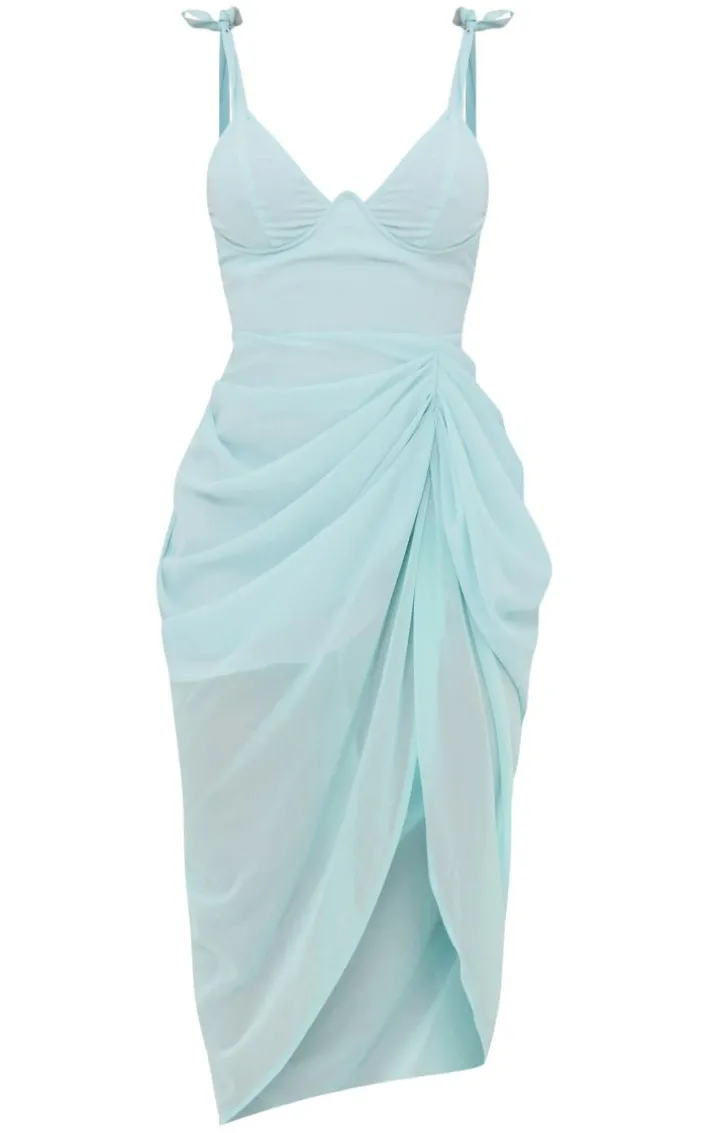 Get occasion season ready with this dreamy light blue underwire detail draped midi dress, you’re sure to have all eyes on you. It is made with a light blue material with a structured underwire detail and a draped design that will channel all the glam vibes into your look, how could you not fall in love? Style with you fave slip-on clear heels and simple accessories for a flawless finish.
