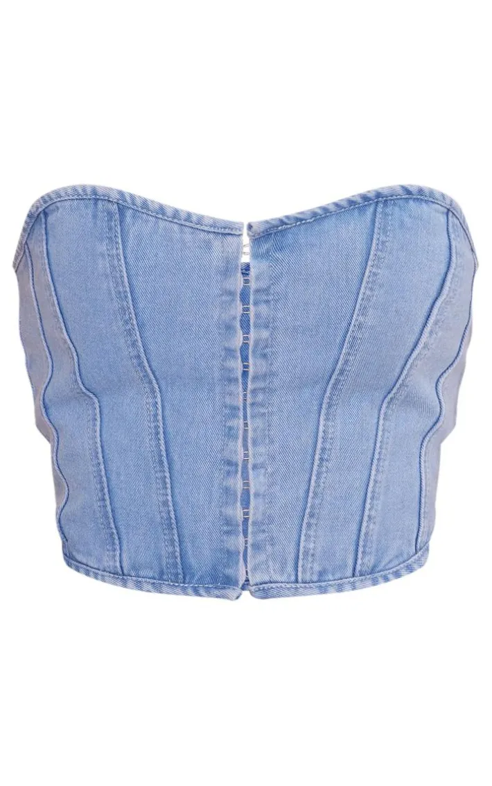 Get ready to show off your shape in this light blue wash denim hook and eye structured corset. Made from a light blue wash denim material with a hook and eye fastening and a structured corset fi, we are obsessed. Channel the perfect double denim look and style with matching jeans, statement accessories and your highest heels for a look that is sure to have heads turning your way doll.