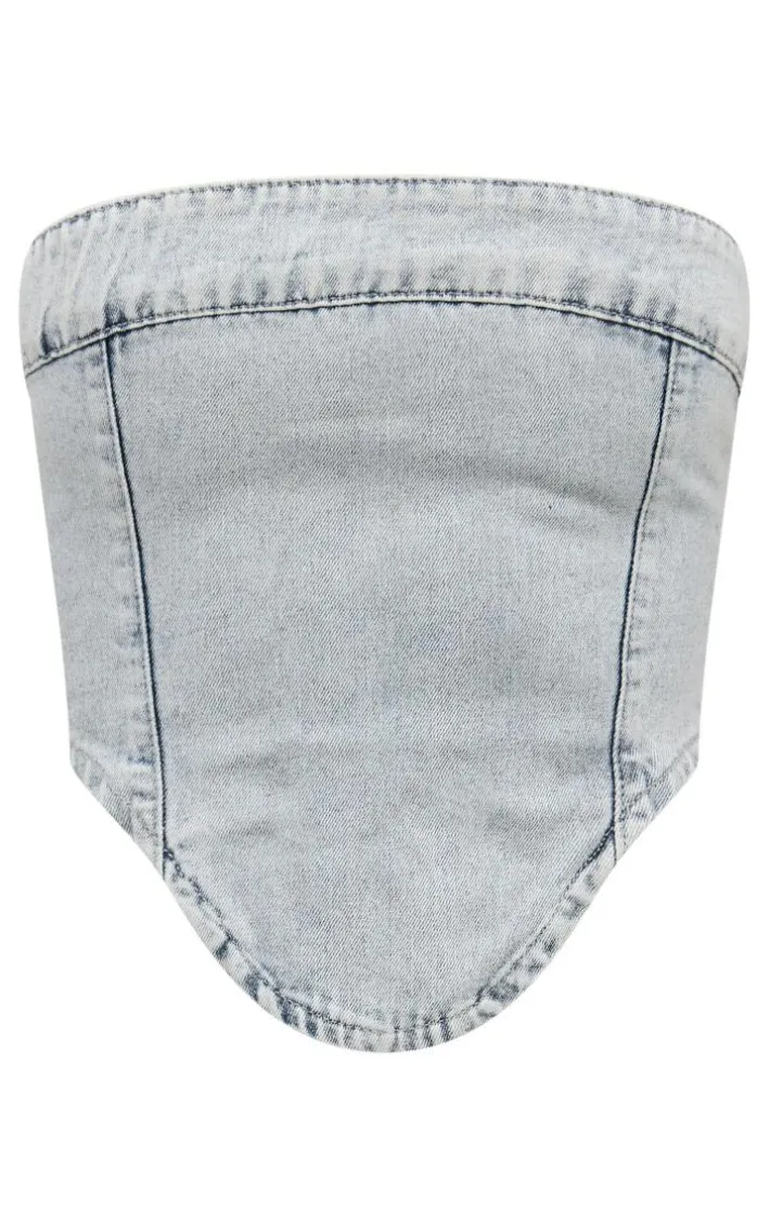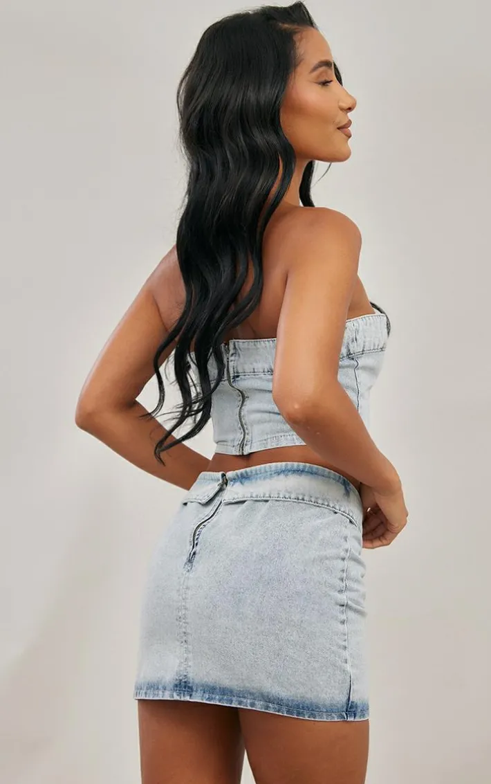 Level up your denim collection with this light blue wash dripped hem bandeau denim top. This top is brought to you in a light blue denim wash material with a dipped hem, how could you turn this down? Whether you have a brunch dateor a date night with your significant other then this top is everything you need. Pair with the matching mini skirt, high heels and accessories for a next-level look.