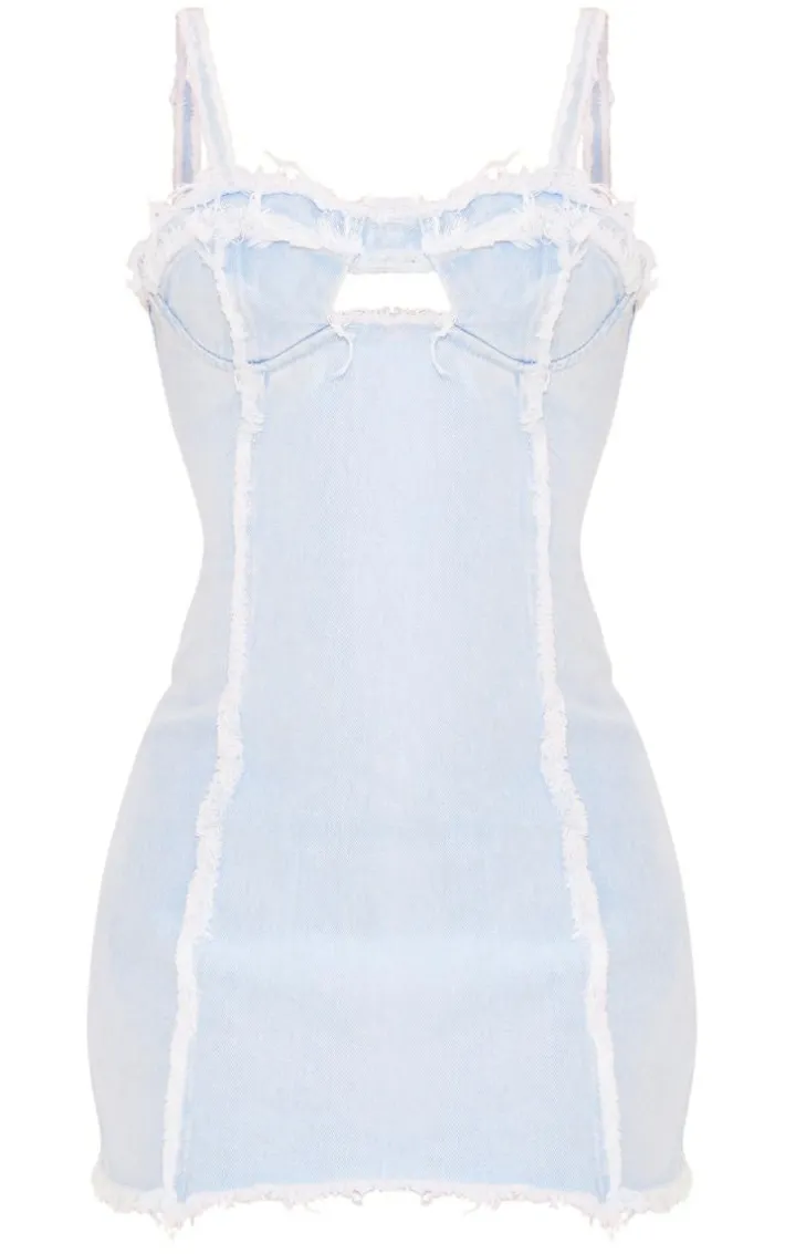 Look all kinds of glam in this light blue wash distressed edge cup detail denim mini dress. This dress is brought to you in a light blue denim material with a distressed edge design for an edgy look we are obsessing over. With a cup detail and a mini length, what’s not to love? Style with some of your fave accessories and a pair of statement boots to complete the look, we are obsessed.