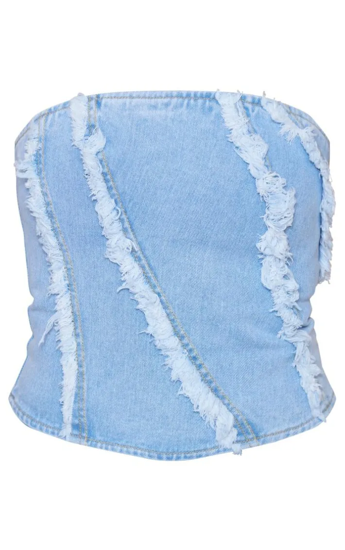 Bring all the glam vibes to your wardrobe with this light blue wash frayed seam detail denim corset top. Its light blue denim material is perfect for the new season and its frayed seam detail adds that extra edge to your look. This corset top is everything that is missing from your wardrobe and is sure to impress. Wear with the matching denim jeans and clear heels for a dreamy double denim look.